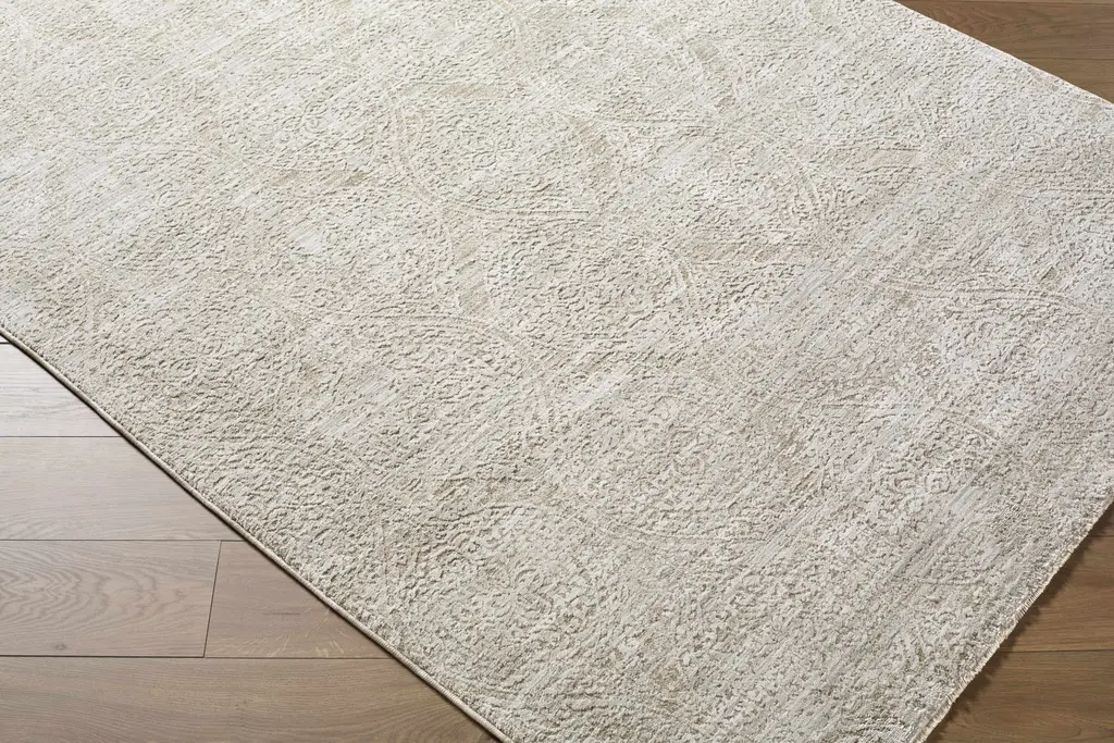 Collection: Cariel Colors: Ash, Silver Gray, Pearl, Prairie Dust, Sage Construction: Machine Woven Material: Face: 100% Polyester Pile: Medium Pile Pile Height: 0.35" Styles: Traditional Made In: Turkey Thickness: 0.43" Price Range: $$$$$ (Affordable)