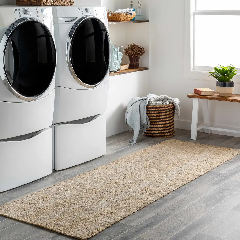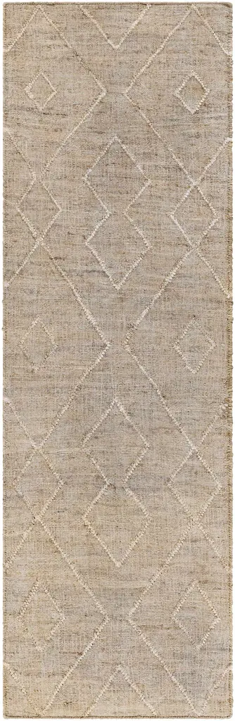 Collection: Carine Colors: Ivory, Beige, Dark Red, Peach, Medium Gray Construction: Hand Woven Material: 100% Jute Pile: Low Pile Pile Height: 0.12" Styles: Transitional,Bohemian Made In: India Thickness: 0.12" Price Range: $$$$$ (Affordable)
