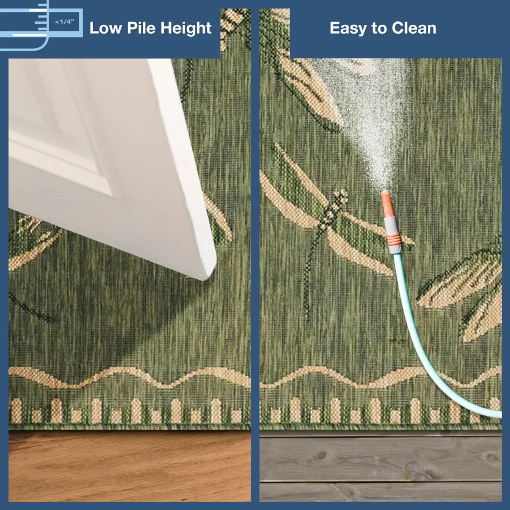 This flat dragonfly area rug brings a touch of classic style to your home. Lively dragonflies are highlighted with a contrasting green background to make this a subtle but striking and dynamic area rug, perfect for welcoming guests in your entryway, living room or as a playful detail on your outdoor patio. Made in Turkey from 100% polypropylene, the Carmel Collection is Power Loomed to create subtle, naturally beautiful multi-toned detailed designs with a high-quality finish. The material is flatwoven, fade resistant, durable and ideal for those high traffic areas such as your patio and living room making this the perfect indoor or outdoor rug. A fresh take on traditional area rugs, patterns range from tropical, coastal, contemporary and classic to seamlessly tie together the design of your home. Limiting exposure to rain, moisture and direct sun will prolong rug life.Expertly machine crafted and imported from TurkeyIntended for both Indoor and Outdoor UseMade from weather resistant 100% Polypropylene for high traffic areas and Indoor/Outdoor placementPile height 0.125"Both Water and Fade ResistantBacking Material: LatexDesigned by Liora ManneA nature inspired design with flying dragonflies on a solid background accented by a dynamic borderThis design features tan border details and dragonflies on a green background Rug Size: 3''3" x 4''11"