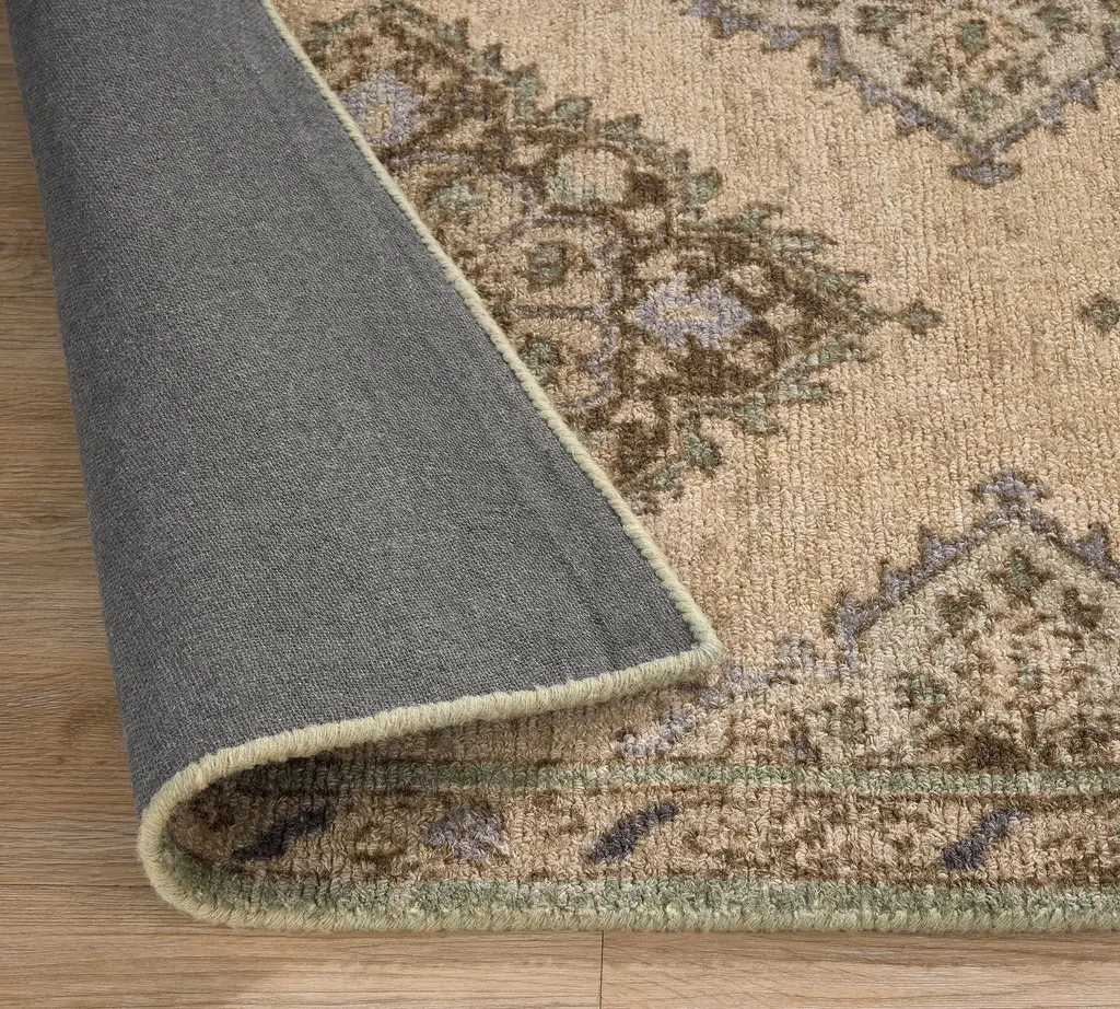 Capturing the timeless beauty of an antique textile, this rug blends old-world artistry with the warmth of a modern palette. Handwoven from wool, the rich fibers are cut with a higher pile for softness and resiliency underfoot.