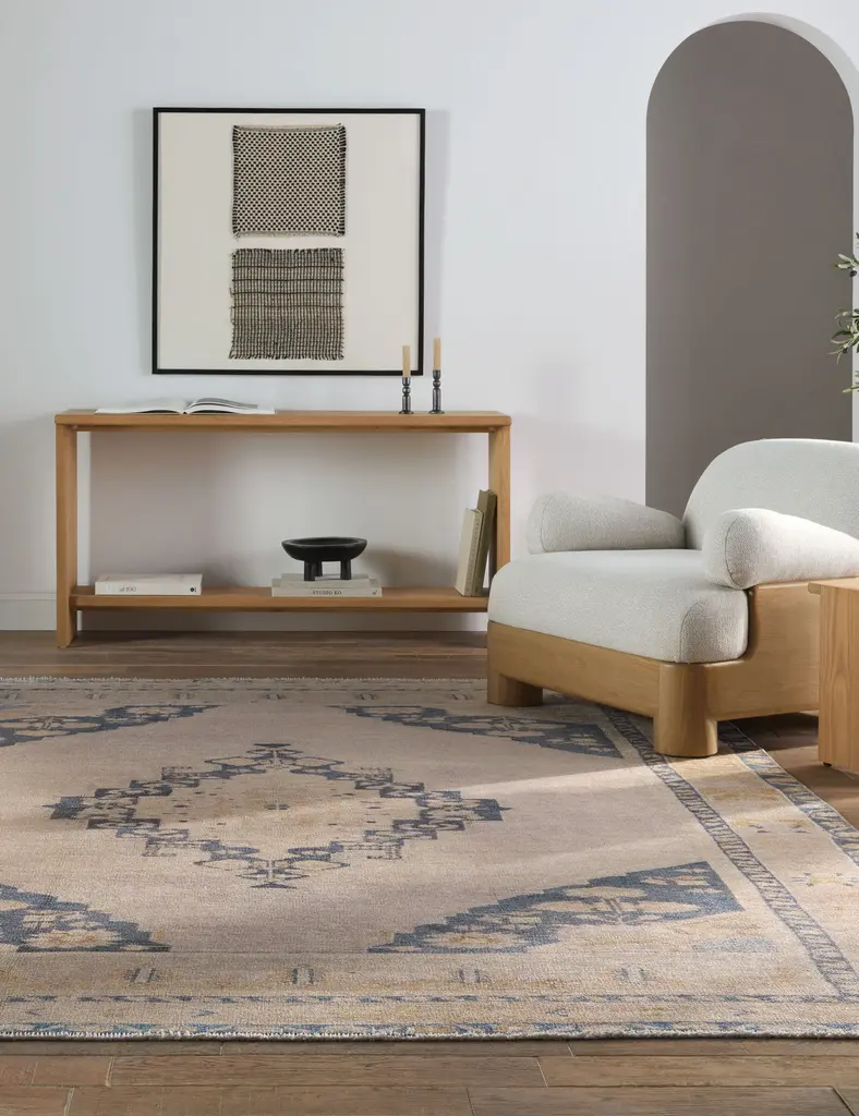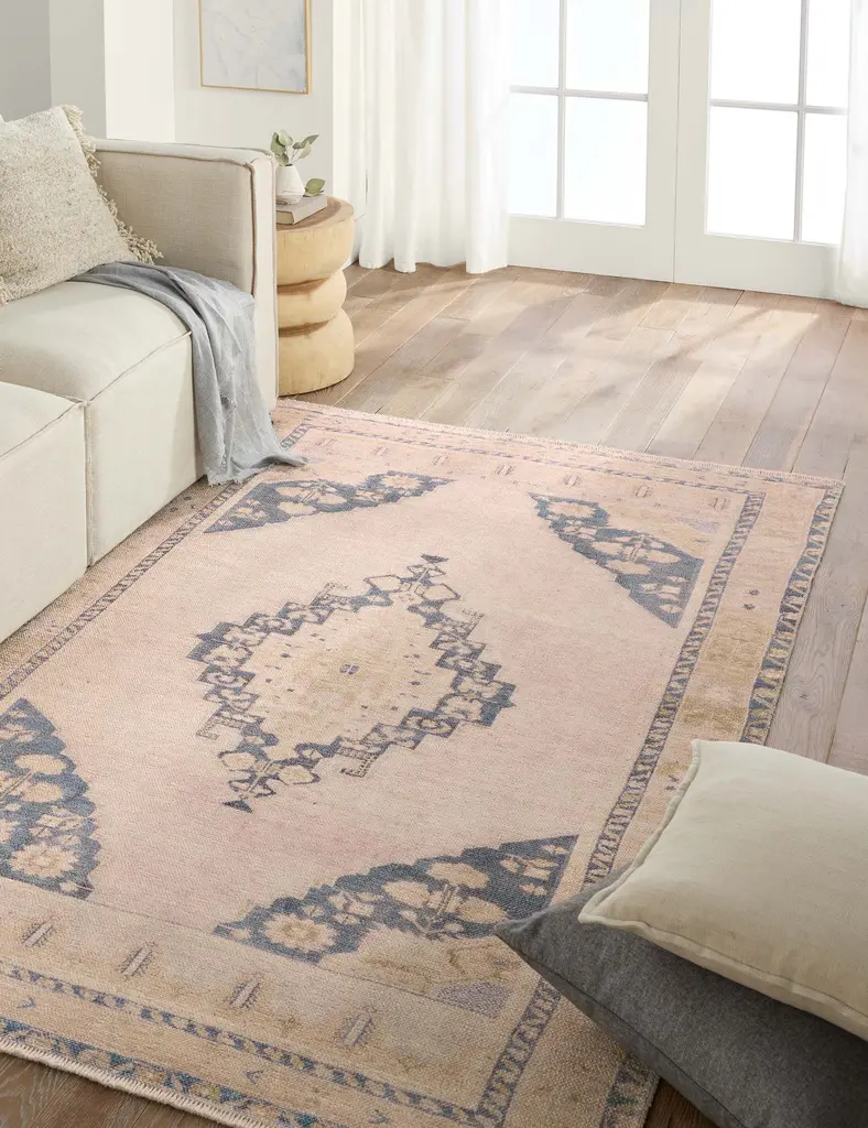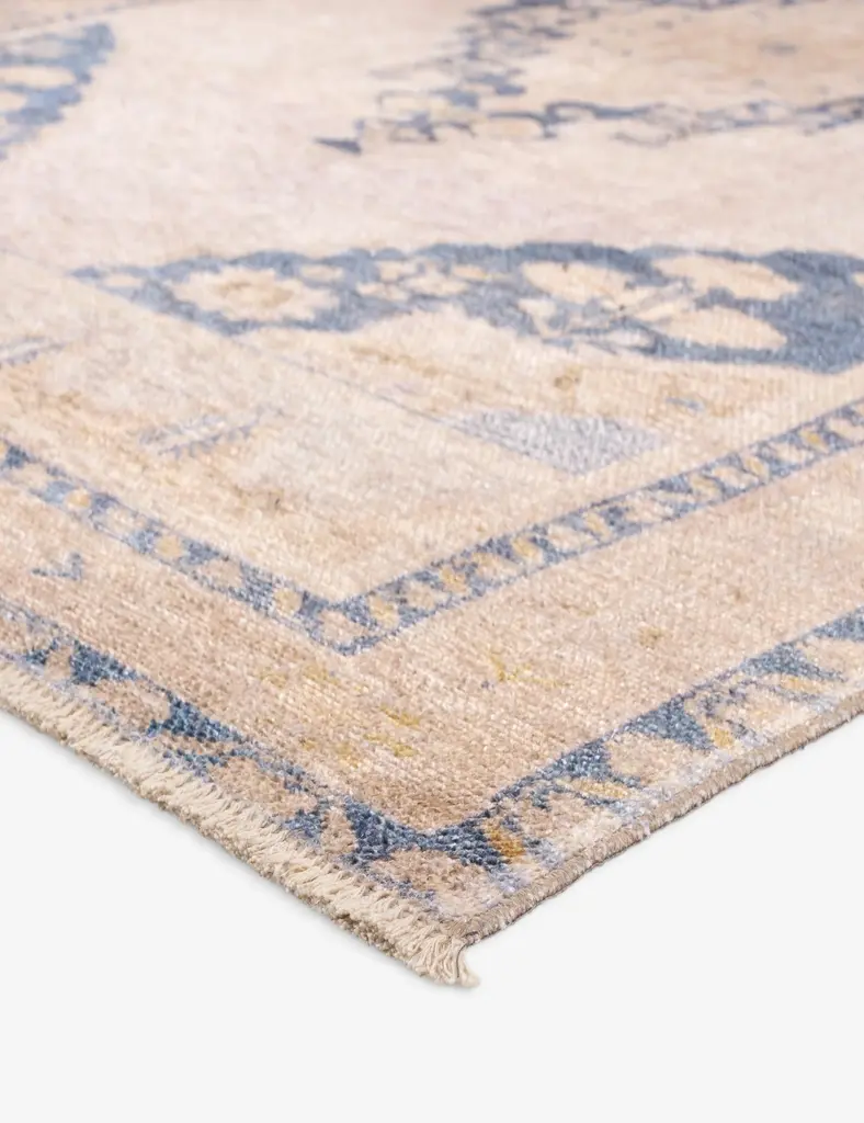 Style a timeless foundation for your space with this vintage rug design. The traditional medallion and geometric border with floral detailing imbues a seasoned tone in a distressed finish with touches of blue. We love this rug's modern construction for its soft tread and easy-care appealperfect for homes where children, pets, or dinner parties make life happen.