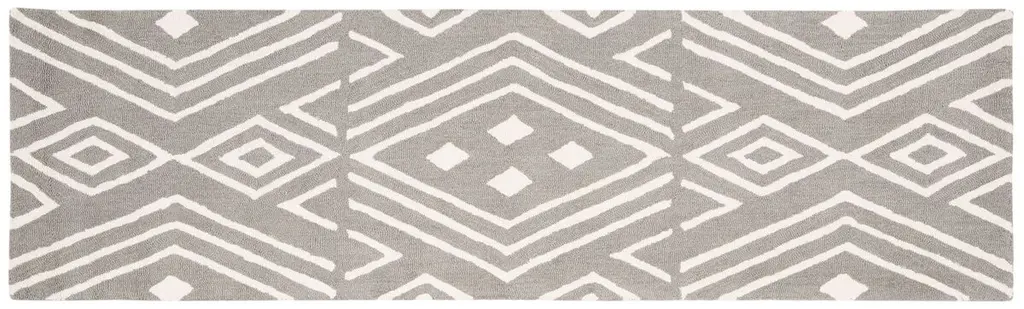 A delightful mix of diamonds and dots. This geometric rug features a stunning pattern of elongated diamonds punctuated by dots, forming a tiled pattern in shades of neutral grey with pops of warm ivory and sunny yellow. Water-resistant, stain-resistant, and machine-washable.