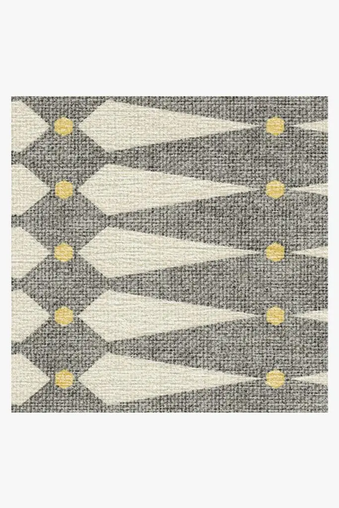 A delightful mix of diamonds and dots. This geometric rug features a stunning pattern of elongated diamonds punctuated by dots, forming a tiled pattern in shades of neutral grey with pops of warm ivory and sunny yellow. Water-resistant, stain-resistant, and machine-washable.