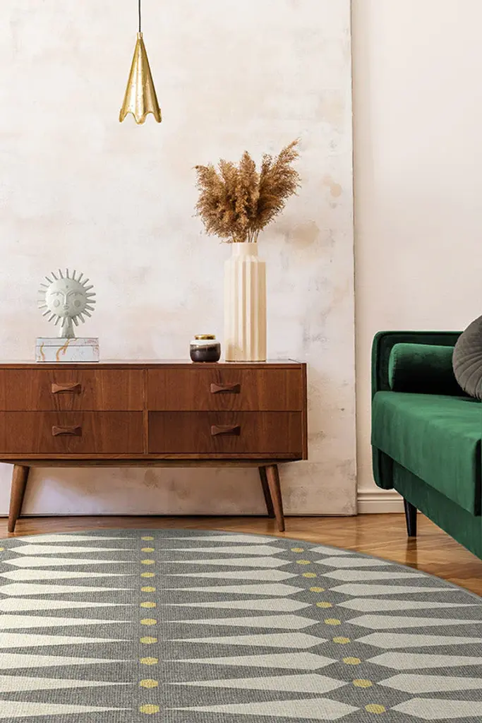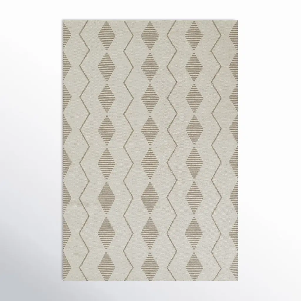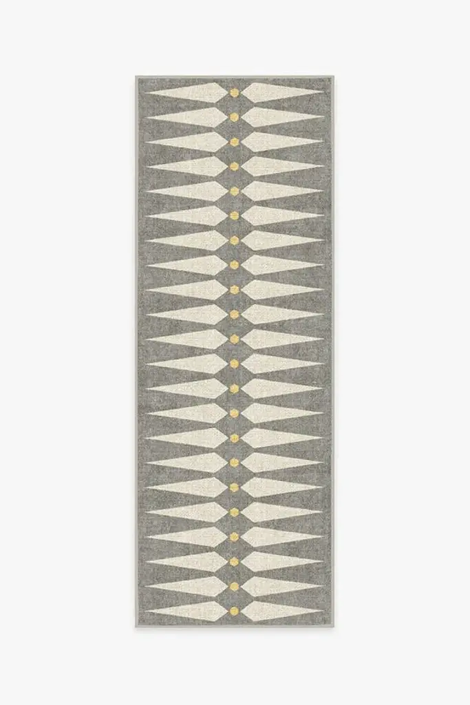 A delightful mix of diamonds and dots. This geometric rug features a stunning pattern of elongated diamonds punctuated by dots, forming a tiled pattern in shades of neutral grey with pops of warm ivory and sunny yellow. Water-resistant, stain-resistant, and machine-washable.