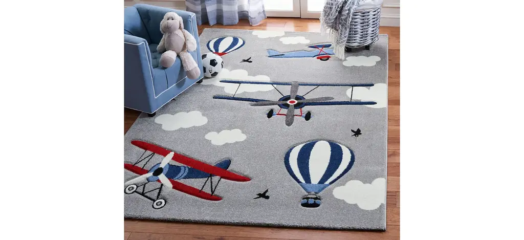 The Carousel Airplanes Kids Area Rug turns fanciful storybook animals and beloved motifs into colorful decor for kids. With pleasing hues and playful etched designs, these delightful kid's rugs sparkle in children's favorite rooms. Carousel Kids rugs are power-loomed using soft yet durable synthetic yarns for lasting beauty even when subjected to years of busy little feet.