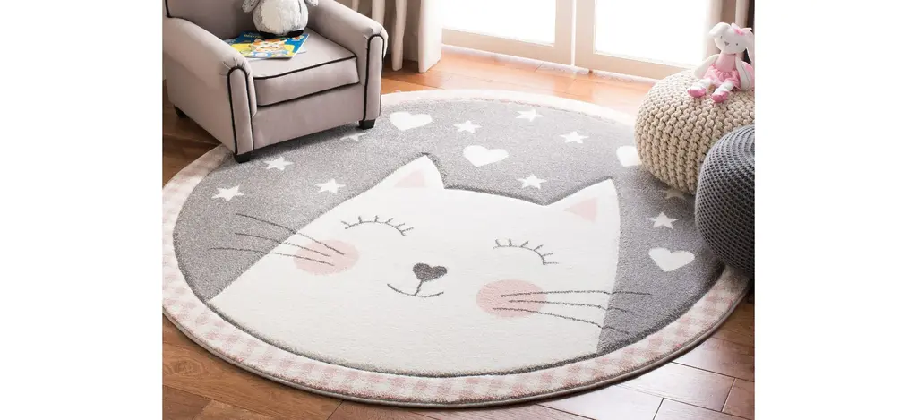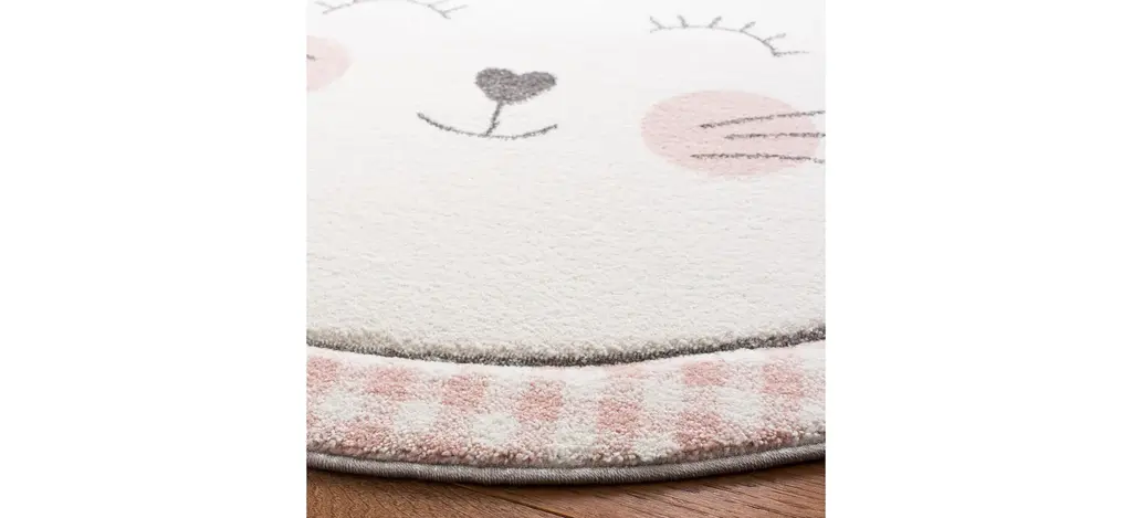 The Carousel Kitty Kids Area Rug Round turns fanciful storybook animals and beloved motifs into colorful decor for kids. With pleasing hues and playful etched designs, these delightful kid's rugs sparkle in children's favorite rooms. Carousel Kids rugs are power-loomed using soft yet durable synthetic yarns for lasting beauty even when subjected to years of busy little feet.