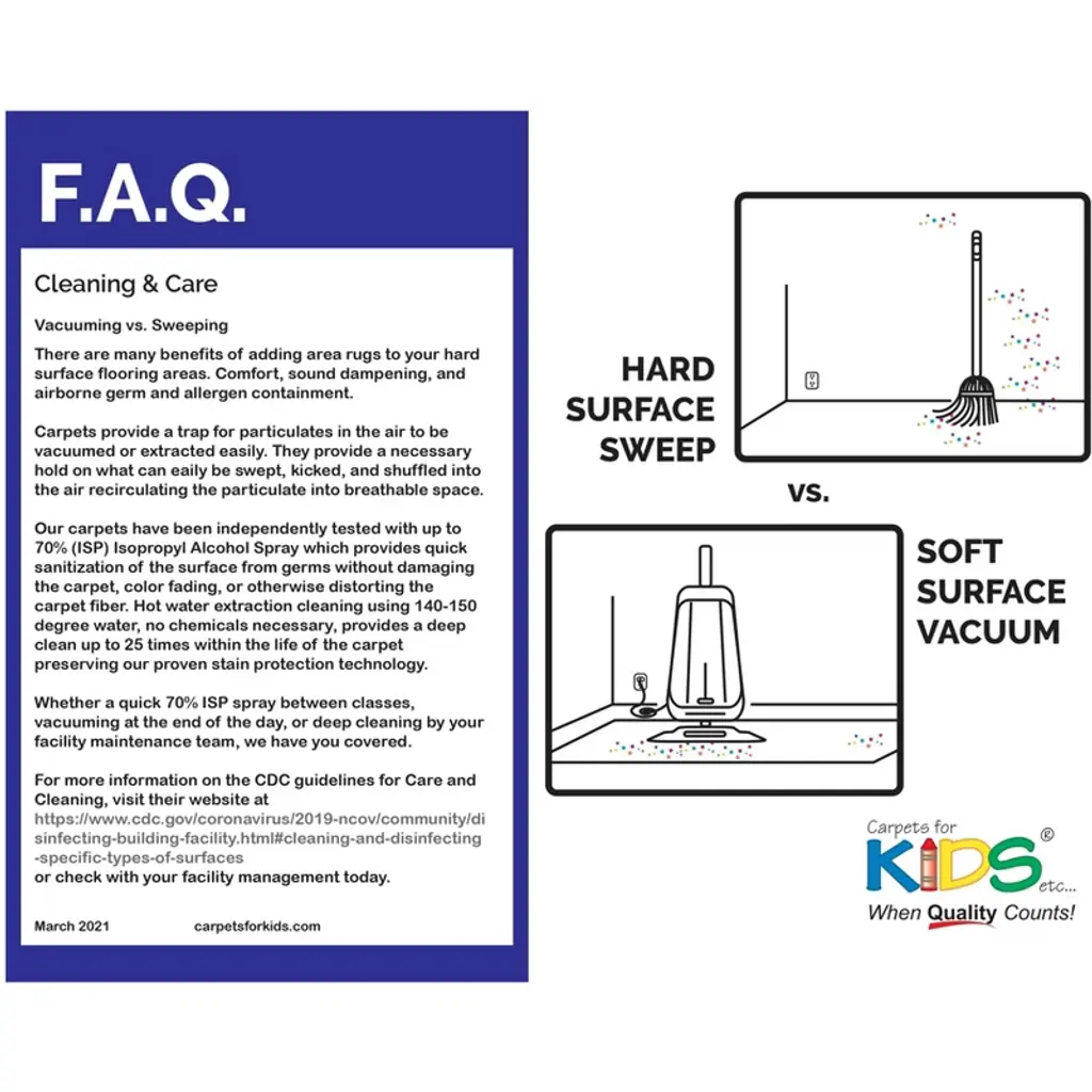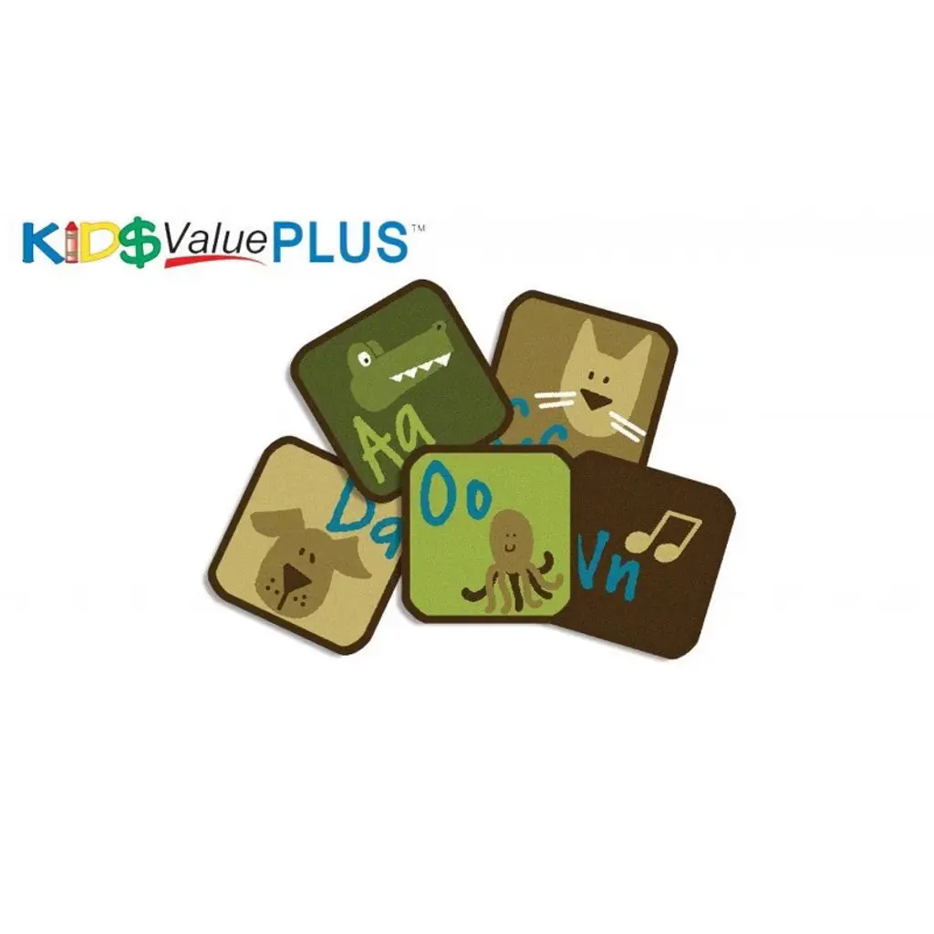 Carpets for Kids KID$Value PLUS Nature Blocks Seating Learning Rug – Set of 26 Enhance your classroom or play area with the Carpets for Kids KID$Value PLUS Nature Blocks Seating Learning Rug. This set includes 26 individual 12" x 12" carpet squares, each featuring a letter of the alphabet paired with a corresponding animal illustration, promoting letter recognition and phonemic awareness. The nature-inspired colors add a calming touch to any educational setting. Key Features & Benefits: Origin: Made in the USA by Carpets for Kids. Collection: KID$ Value PLUS. Face Weight: 14 oz/sq-yd. Surface Material: Commercial Cut Pile Carpet – 100% Continuous Filament Type 6 Nylon – Recyclable. Anti-stain Treatment: Up to 25X Stain Protection – True Stain Blocker Technology makes clean up a cinch using only hot water extraction with no harsh chemicals necessary. All fibers completely saturated with stain treatment. Backing Material: KIDply Backing System features a revolutionary patented technology that assures your rug looks better longer with dimensional stability. Helps prevent wrinkling & creasing & unmatched softness & flexibility. Fire Code Rating: Meets NFPA 253, Class I fire code requirements. Mfg Warranty: 8-Year Limited Abrasive Wear Warranty, No Fault Edge Warranty, Advanced Anti-Static Protection, Advanced Stain Protection. No Fault Edge Warranty: We will replace the edging on your rugs no matter how long they have been in the classroom. Just pay shipping one way.