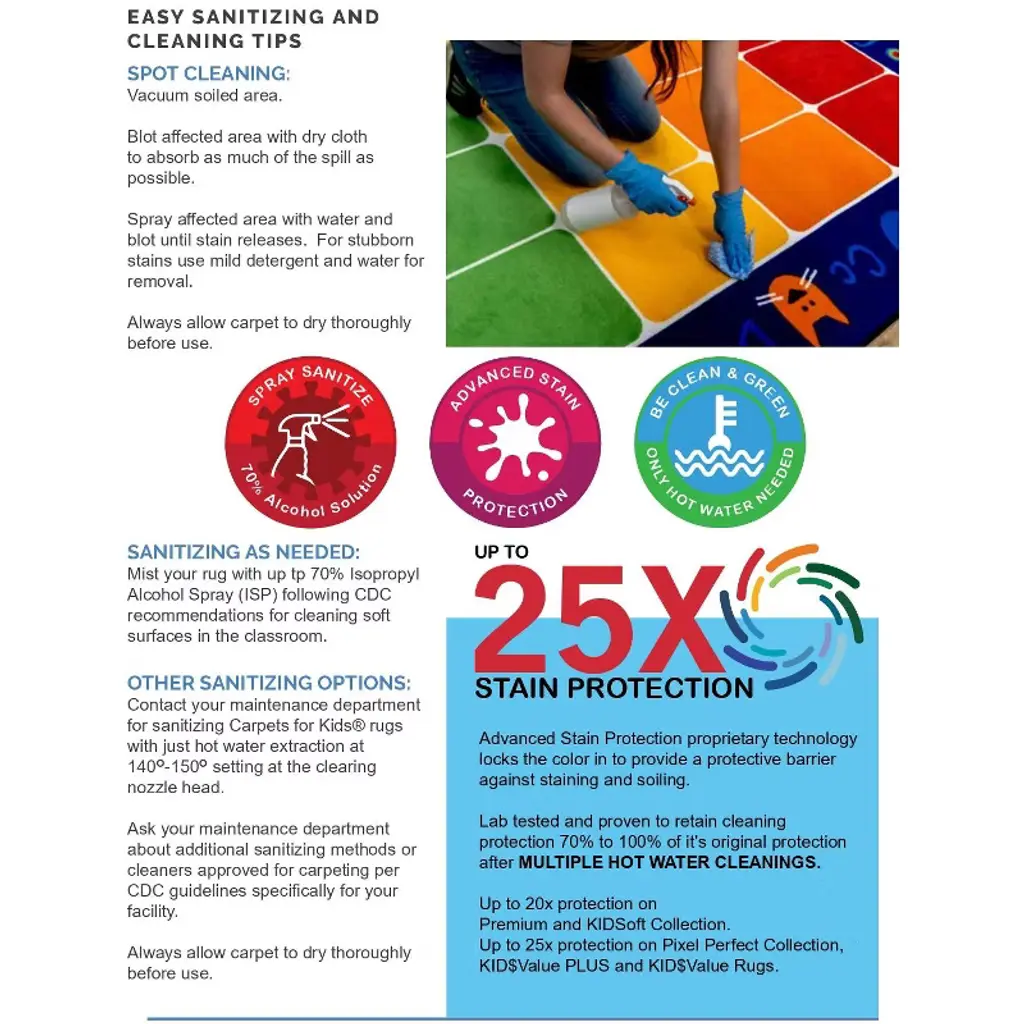 Carpets for Kids PLUS Simple Numbers Seating Learning Rug – 16" Squares Kit, Set of 12 Make learning numbers fun and interactive with the Carpets for Kids PLUS Simple Numbers Seating Learning Rug Kit. This set includes 12 individual 16" square rugs, each displaying a number in bright, bold colors. Perfect for classrooms, daycares, or homeschooling, these rugs help children develop foundational number recognition and counting skills in a fun, hands-on way. Key Features & Benefits: Origin: Made in the USA by Carpets for Kids Collection: KID$ Value PLUS Face Weight: 14 oz/sq-yd Surface Material: Commercial Cut Pile Carpet – 100% Continuous Filament Type 6 Nylon – Recyclable Anti-stain Treatment: Up to 25X Stain Protection – True Stain Blocker Technology makes clean up a cinch using only hot water extraction with no harsh chemicals necessary. All fibers completely saturated with stain treatment Backing Material: KIDply Backing System features a revolutionary patented technology that assures your rug looks better longer with dimensional stability. Helps prevent wrinkling & creasing & unmatched softness & flexibility Fire Code Rating: Meets NFPA 253, Class I fire code requirements Mfg Warranty: 8-Year Limited Abrasive Wear Warranty, No Fault Edge Warranty – We will replace the edging on your rugs no matter how long they have been in the classroom. Just pay shipping one way, Advanced Anti-Static Protection, Advanced Stain Protection