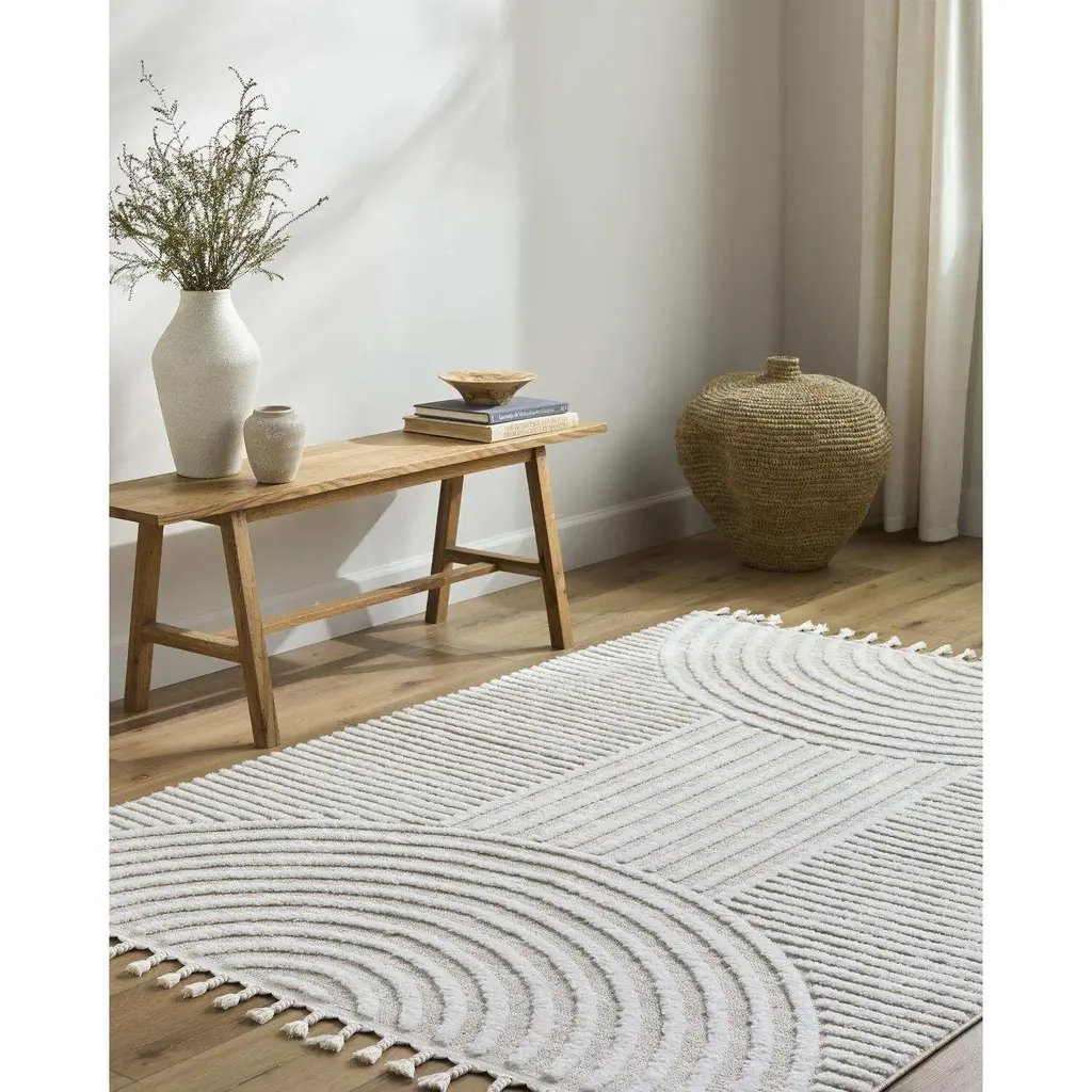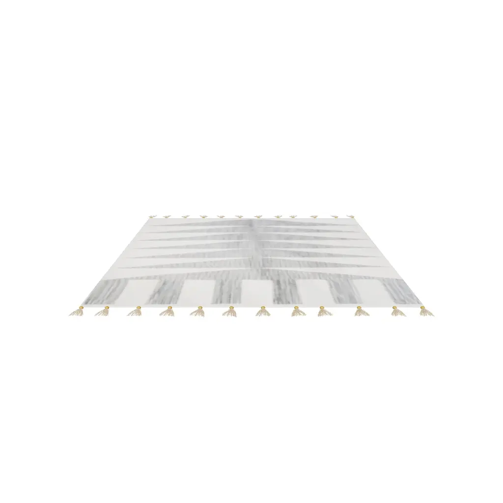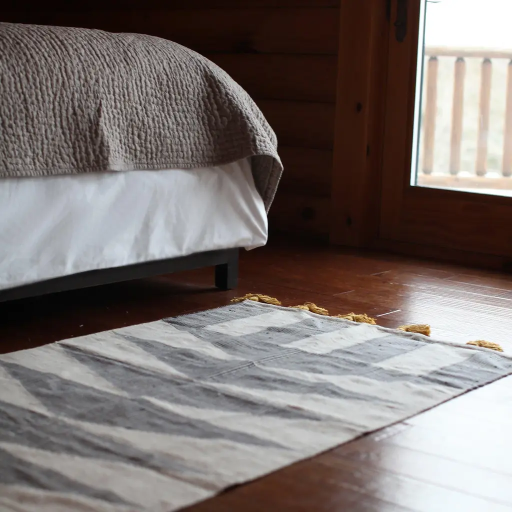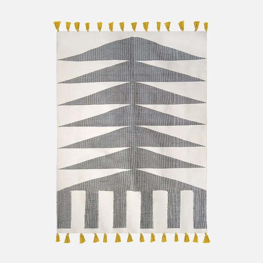 The Cascade Grey area rug has a design that mimics the movements and landscapes from the earth. These grey rugs have thick, colorful tassels that add richness and texture to the soft rugs. The gray rug with white cream is a washable cotton rug that fits seamlessly into contemporary home decor while preserving Egyptian cultural heritage by enabling the weavers to practice and execute a craft that has been passed down to them from generation to generation. The grey area rug has yellow gold tassels.