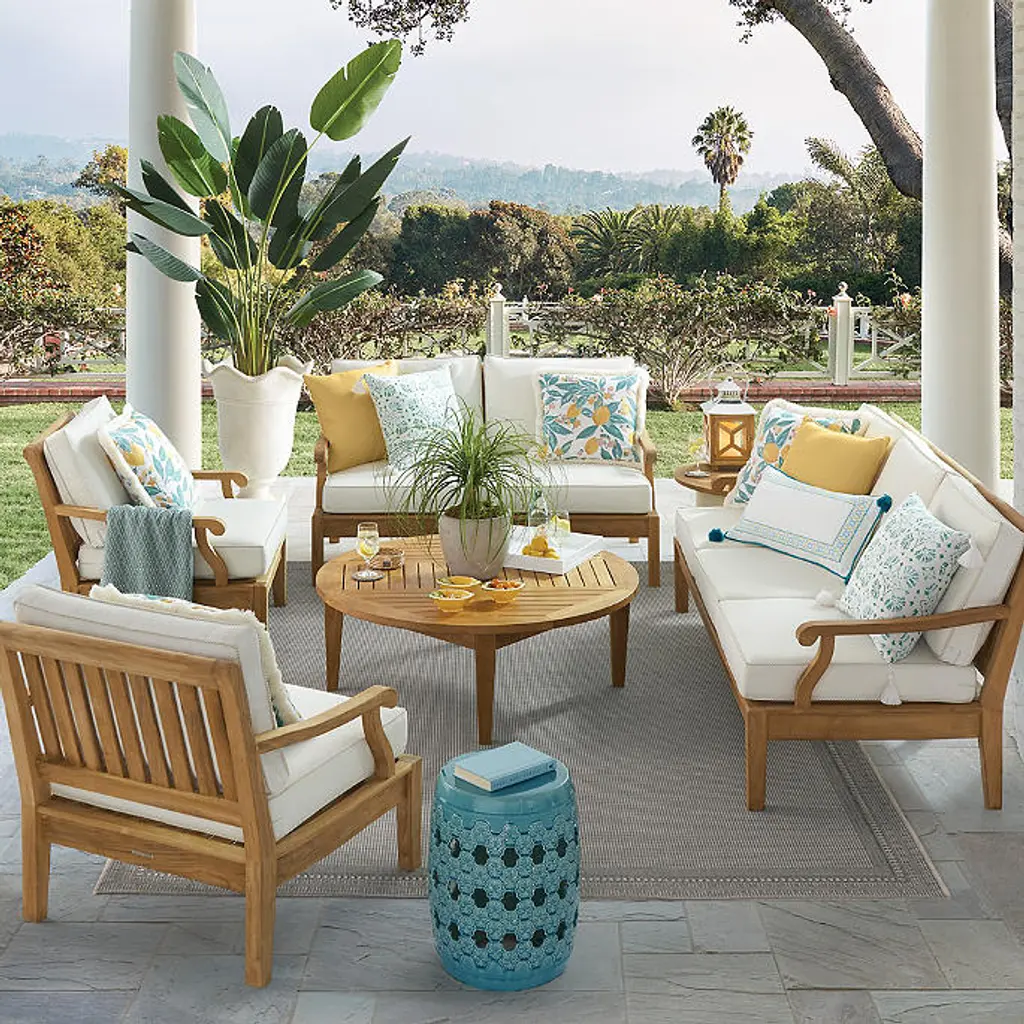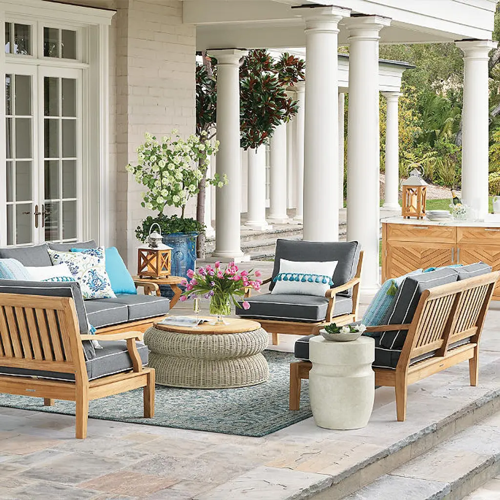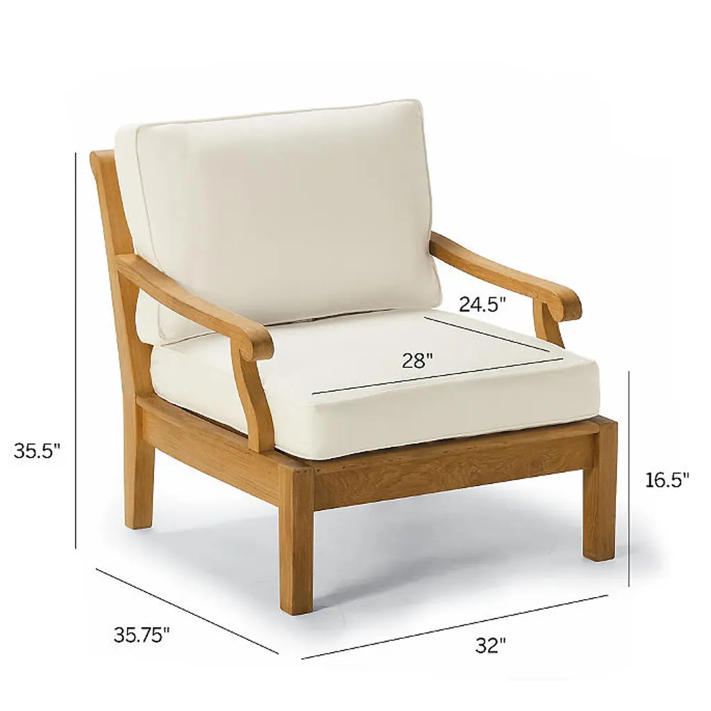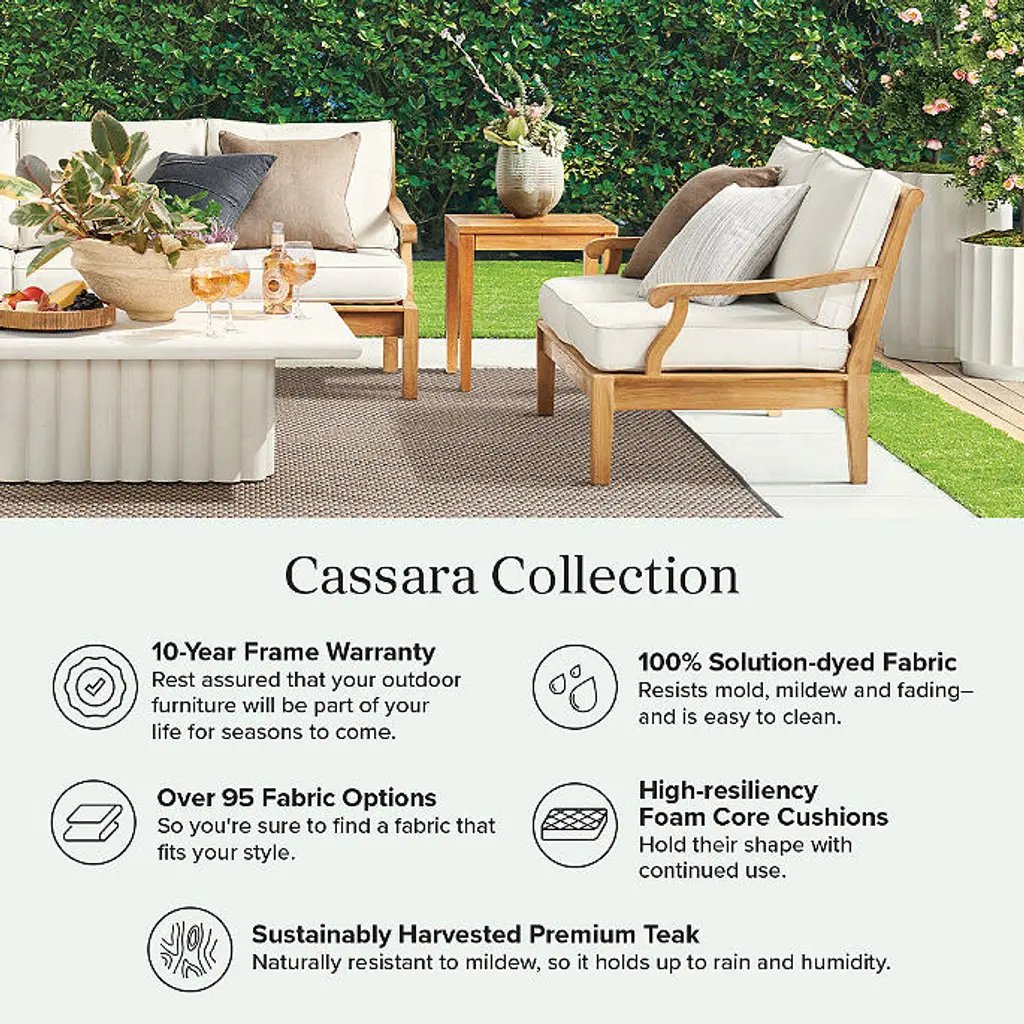 A grand scale and teak hardwoods make our Cassara Lounge Chair the perfect destination at the end of the day. The seating is handcrafted of high-quality teak that has been kiln dried to eliminate expansion and shrinkage. Stainless steel hardware is fully concealed, so nothing interrupts the clean, smooth lines. Included cushions are covered in the industry’s best all-weather fabrics. Part of the Cassara Collection Estate-size seating Hand-built from sustainably harvested, high-quality teak that is naturally resistant to mildew, so it holds up to rain and humidityDurable teak frame is kiln dried to remove moisture, guarding against warping and cracking, and sanded by hand so it's smooth to the touchTeak naturally releases resinous oils as it weathers; using a rug is recommended to help prevent staining of deck or patio surfaces Finely sanded finish Fully-concealed stainless steel hardware Teak will develop a lovely silver patina if left untreated Cushions included 100% solution-dyed and woven fabrics Cushions have a high-resiliency foam core wrapped in plush polyester Cushions also available with 100% waterproof Sunbrella® Rain performance fabric Piping color on cushion matches the stripe color Assembly required; view instructions Imported Type of Cushion: Standard: Multiple layers of high-resiliency, high-density foam core with soft polyester wrap.Quick Dry: Faster drainage and 35% faster dry time. Open-cell foam wrapped with densified polyester and a quick-dry center, lined for extra comfort. Removable cover has mesh panel on the bottom for maximum drainage.At Frontgate, our primary focus is quality. We guarantee that every product we sell will stand up to the supreme test – our customers' satisfaction. To learn more about our policies, visit our Shipping & Processing, Returns & Exchanges and Warranty & Price Guarantee pages.Please note: Digital renderings of custom upholstery may differ in pattern placement from the actual item. Because colors can vary from screen to screen, we recommend ordering a swatch before completing your order. We offer free swatches of all our outdoor fabrics. 10-swatch maximum. Solid and stripe swatches measure 4"x4" and pattern swatches measure 8"x8". View and order swatches here.