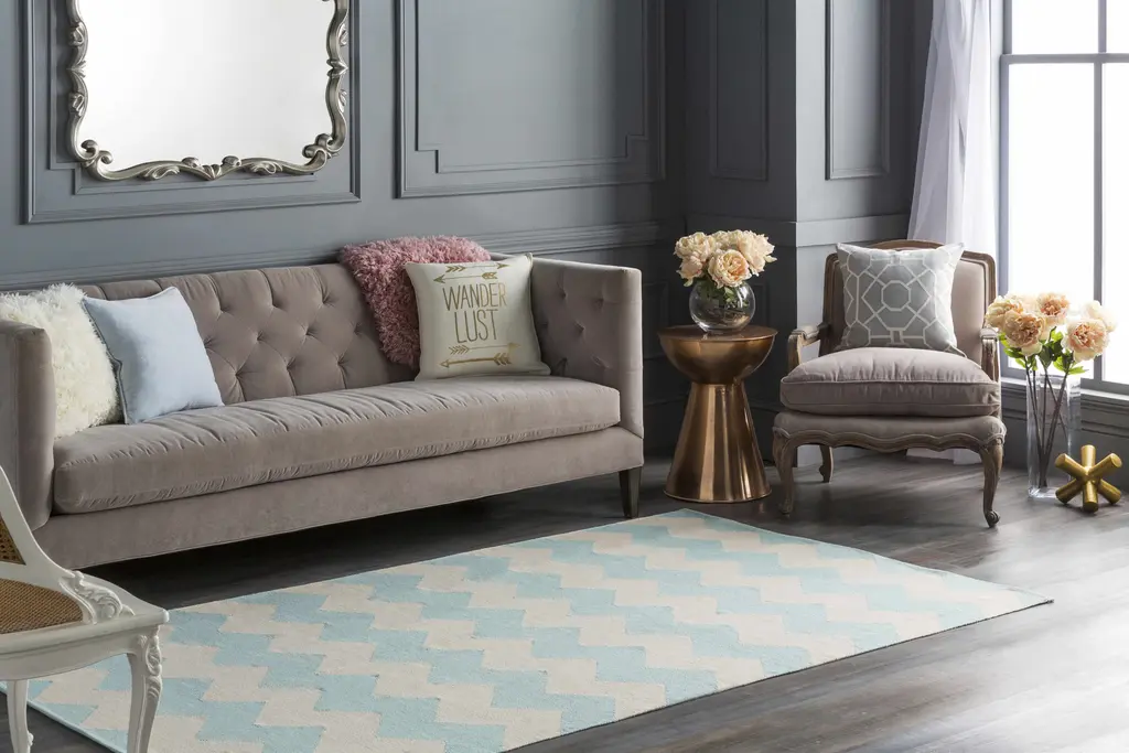 Collection: Caswell Colors: Ice Blue, Sky Blue, Ivory Construction: Hand Woven Material: 100% Cotton Pile: No Pile Styles: Contemporary Made In: India Price Range: $$$$$ (Most Affordable)
