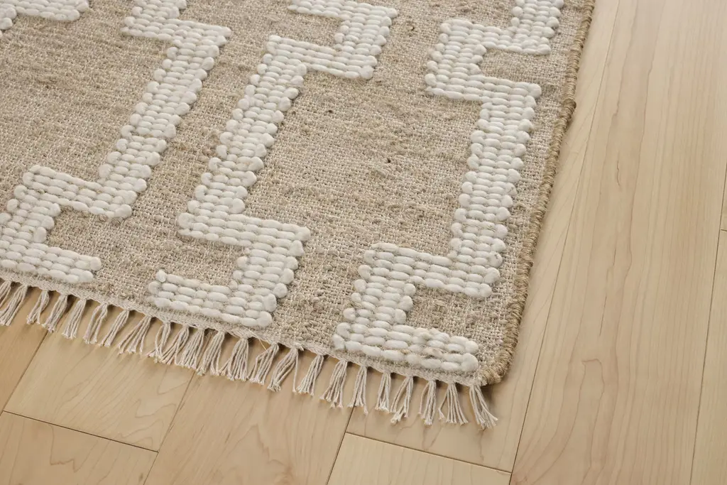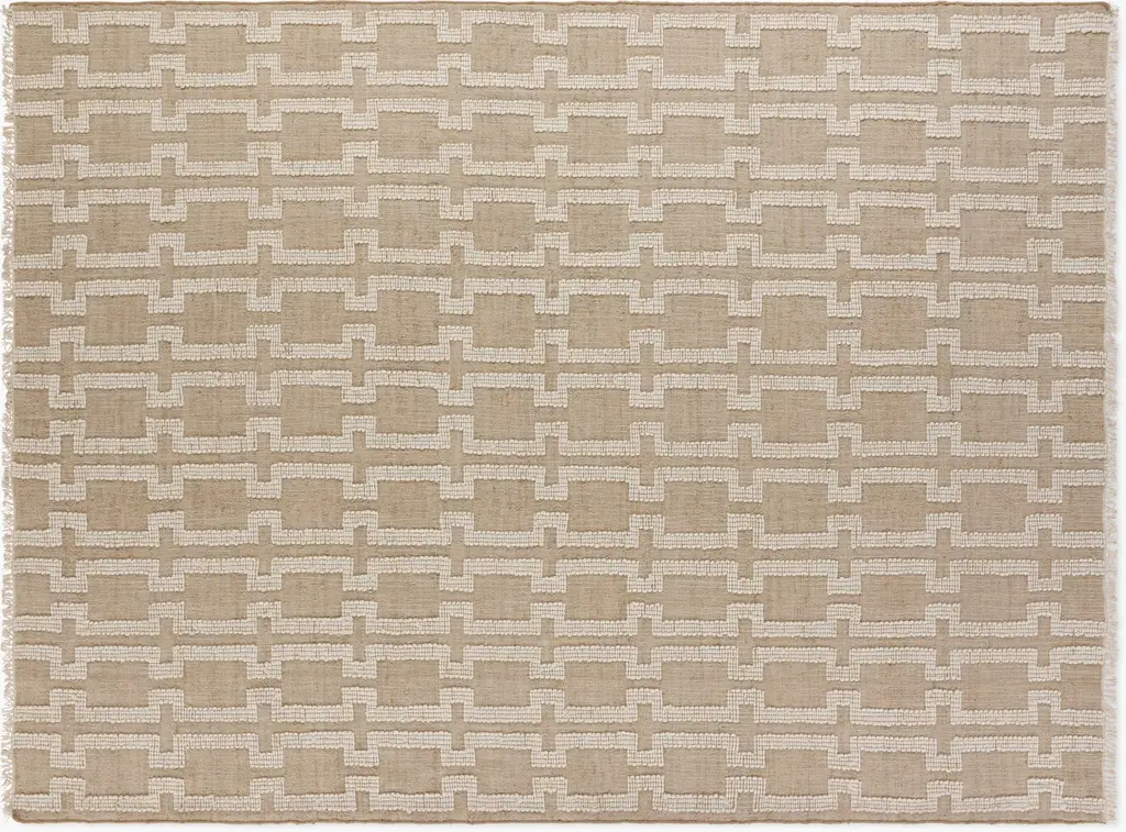 Flatweave rugs are designed for modern living. Having no pile keeps the aesthetic simple and sleek, while also making these rugs durable. The DWR Rug Collection's Catena Flatweave Jute Rug (2023) features an architectural column motif that brings visual energy to neutrals and textural interest to any space with its pattern embroidered in wool onto a jute ground. Made in India.