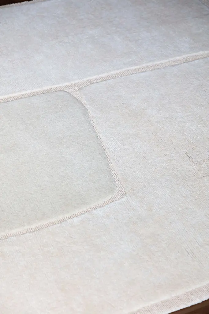 Hand knotted in the cc-tapis atelier in Kathmandu, Nepal. The rug is made with a cotton weave, a Himalayan wool and bamboo silk, coming from the areas surrounding the atelier. 89.000 individual knots per square meter approximately. The sale of every rug supports cc-foreducation. Size: 7.5' x 9,8' ft. B (89.000 knots/sqm approximate)Fascinated by the sculptures of Isamu Noguchi, Parisotto and Formenton investigate the geometry and the joints between fluid forms. A rug that plays with the juxtaposition of different materials in the same chromatic tones. Glossy and opaque effects are given-off from the mixture of materials. Each reacting differently under the same light. A reaction that makes the perception of monochromatic contrast possible. Available in Coco, Standard, Petrol, Ice