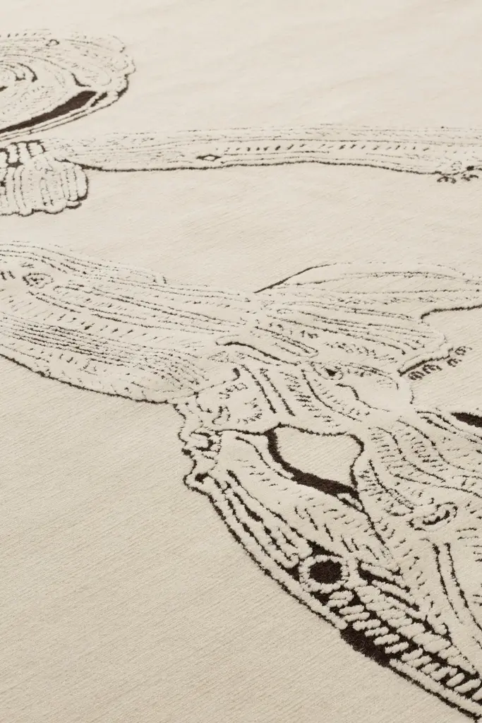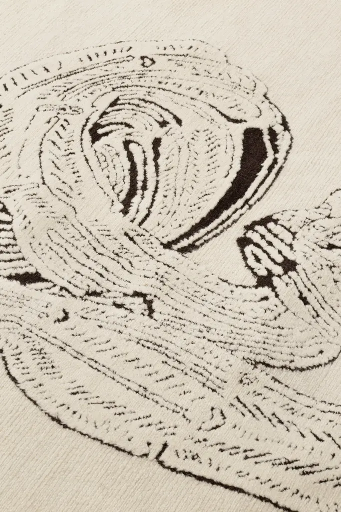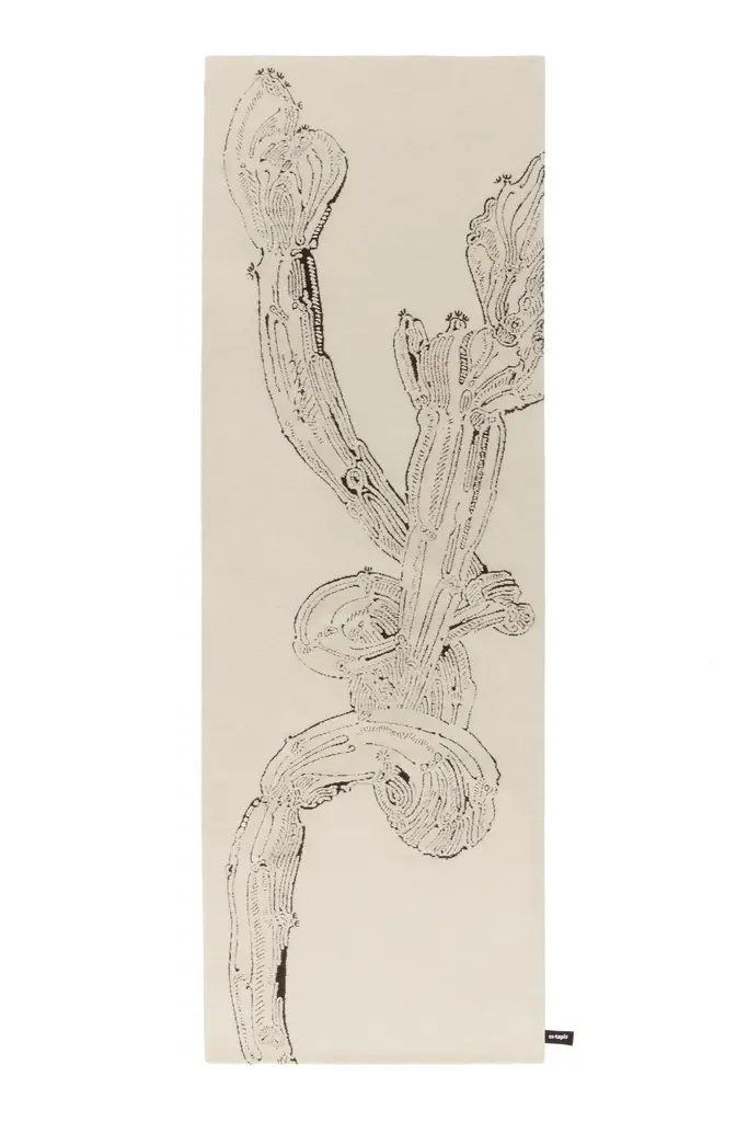 A new collection inspired and developed from Bethan’s ink drawings, made in confinement during lockdown. Bethan decided to take the opportunity to draw every couple of days, sketching her Euphorbia Sipolisii f. Crestata succulents, fascinated by their curls. Working with cc-tapis, they developed a delicate triptych and a large single rug, made entirely in Himalayan wool. cc-tapis artisans interpreted the original drawings of Bethan with black wool whilst the natural tones of the undyed pile gently and delicately cover the design, purposefully knotted with a longer yarn. A contrast which respects and echos the marks of the ink pen Bethan used.Hand knotted in the cc-tapis atelier in Kathmandu, Nepal. The rug is made with a Himalayan wool coming from the areas surrounding the atelier. 152.000 individual knots per square meter approximately. The sale of every rug supports cc-foreducation. Size: 7.5' x 9.8' ft A (125.000 knots/sqm approx.)