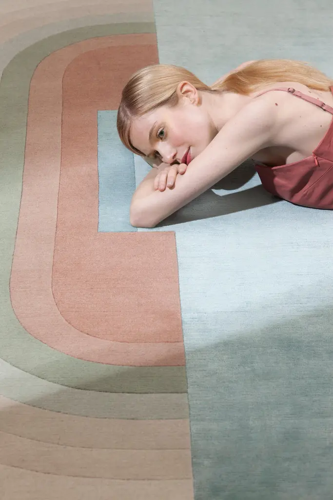 Hand knotted in the cc-tapis atelier in Kathmandu, Nepal. The rug is made with a cotton weave a Himalayan wool and pure silk coming from the areas surrounding the atelier. 152.000 individual knots per square meter approximately. The sale of every rug supports cc-foreducation. Size: 5' x 7.9' ft. A+ (152.000 knots/sqm approx.)From a photo of a flight of stairs in Venice, came the idea to reinterpret the iconic image of the steps covered in water by the lagoon. The different tones of gray of the wool create the stone steps, marked by salt and the effects of time. The sea and the vibrations of the waves are transformed into a shimmering silk surface where tones of blue and green radiate together. Made 50% of wool and 50% of silk.