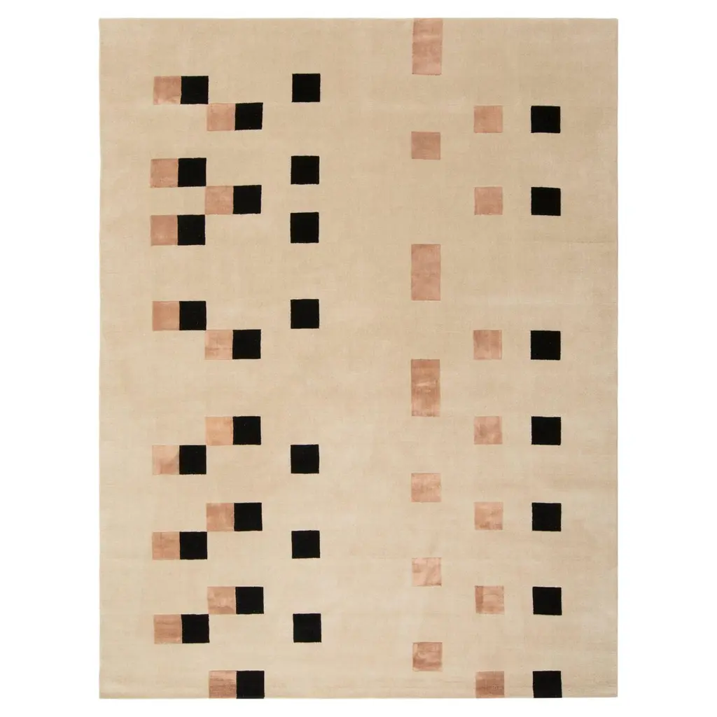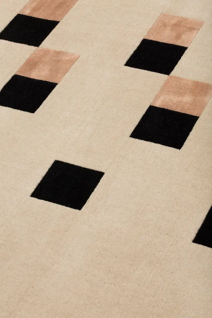 Geometric elements, evoking the avant-garde textiles of the early 1900s, a theme which runs through the whole Hello Sonia Family, are now arranged harmoniously in a musical score made up of pauses, solos, semitones and counterpoints, the punctuation of sheet music. Handwoven in the cc-tapis atelier in Kathmandu, Nepal. The rug is made with a cotton weave, Himalayan wool and bamboo silk pile coming from the areas surrounding the atelier. The sale of every rug supports cc-foreducation.