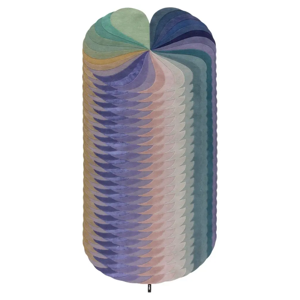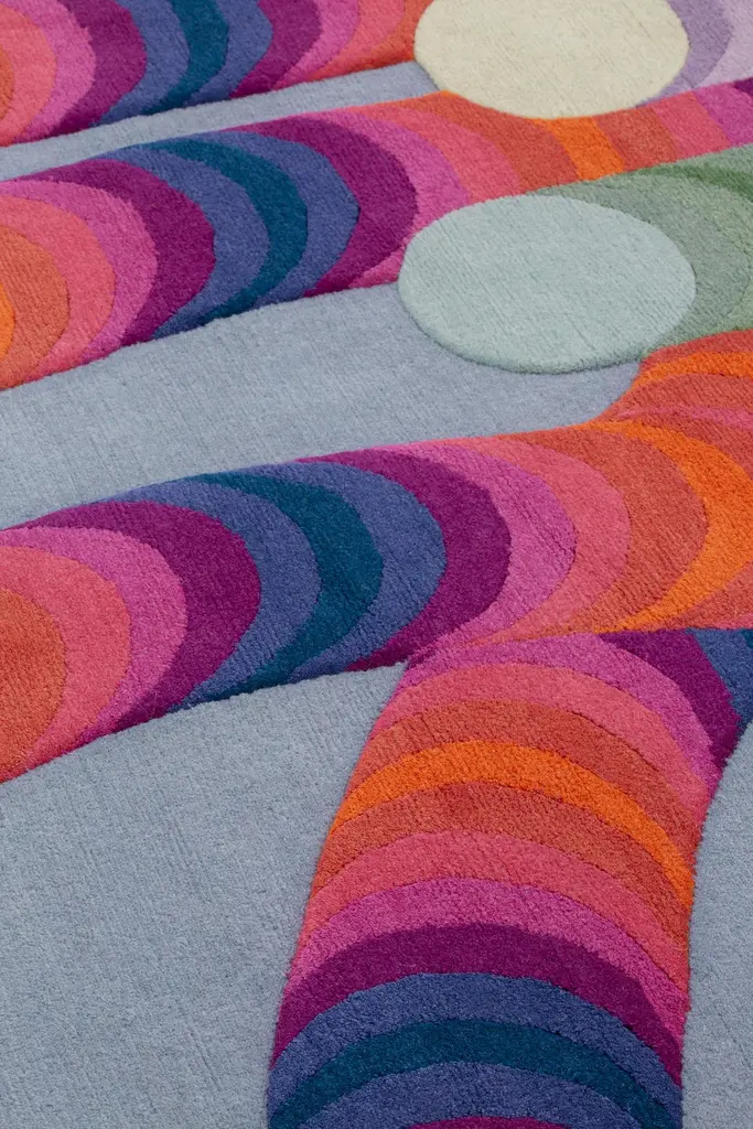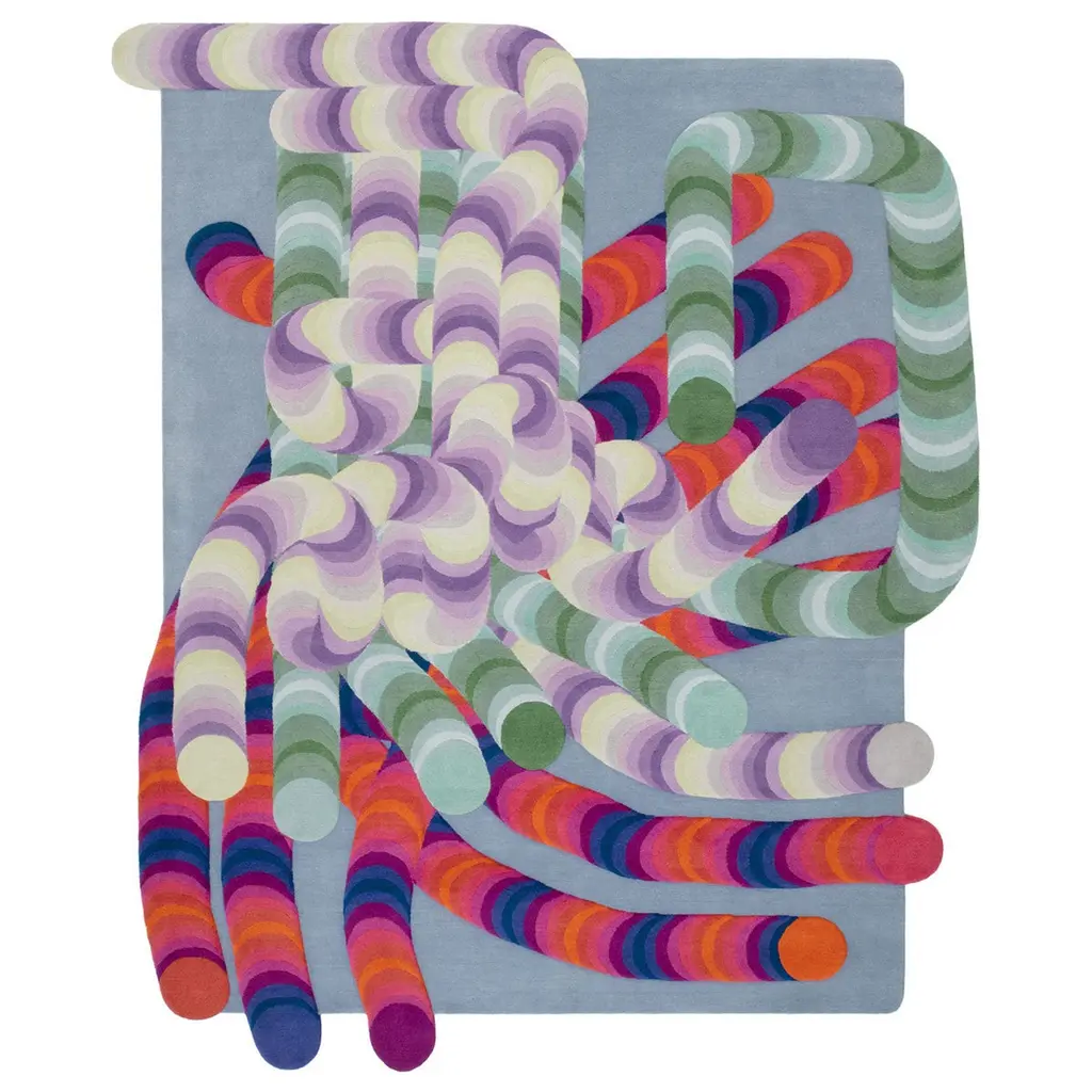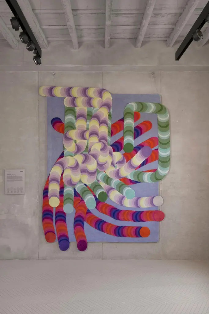 Research which began with the Slinkie Collection for cc-tapis, Pipeline is the translation of Urquiola’s digital artworks into an artisanal product. A series of connected tubes emerge from the surface of the rug and create a labyrinth of color whose volume gives a sense of depth to the rug. Multiple chromatic evolutions that develop through circular movements, overlapping on different levels of Himalayan wool, focusing the gaze on the space outlined by the tubes.