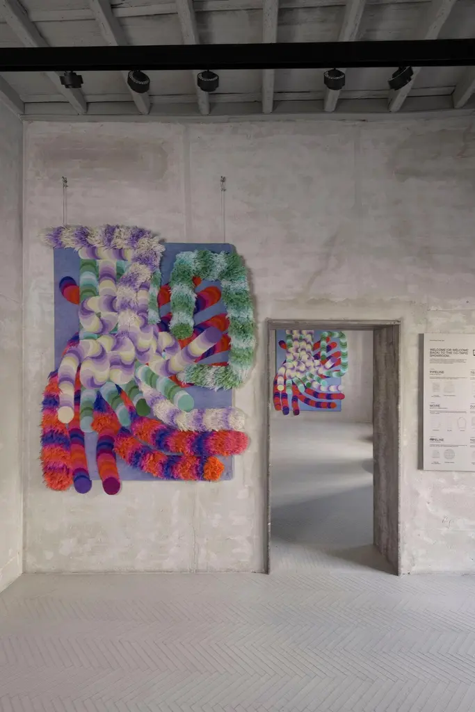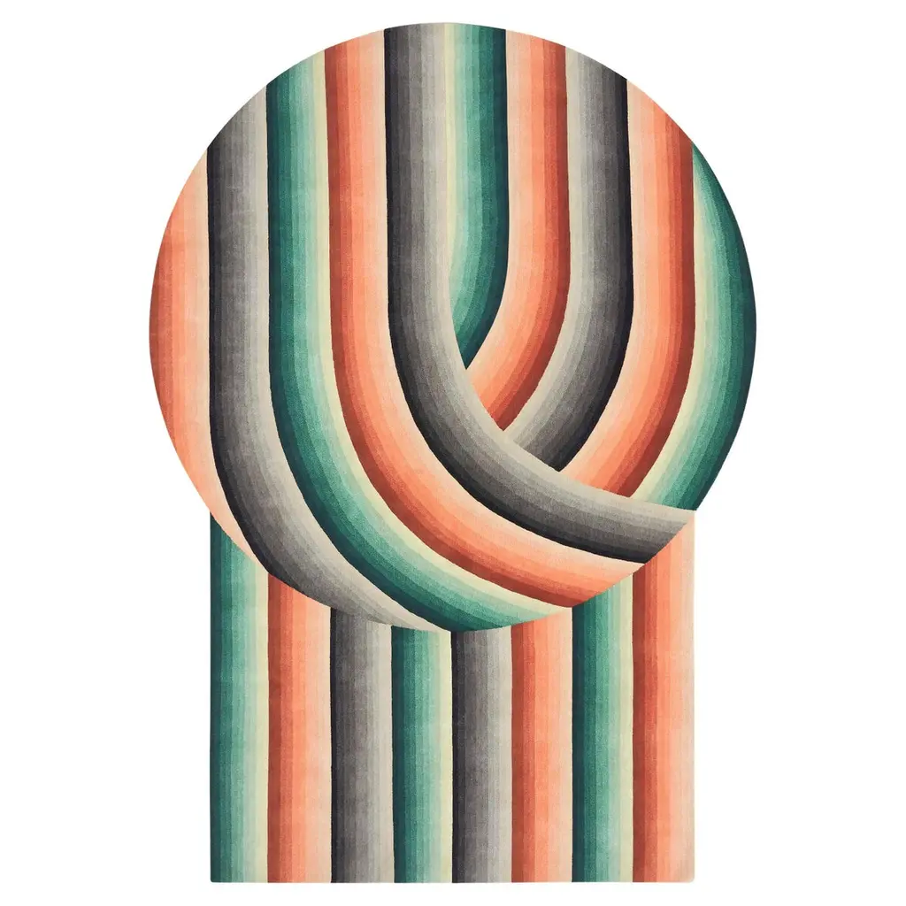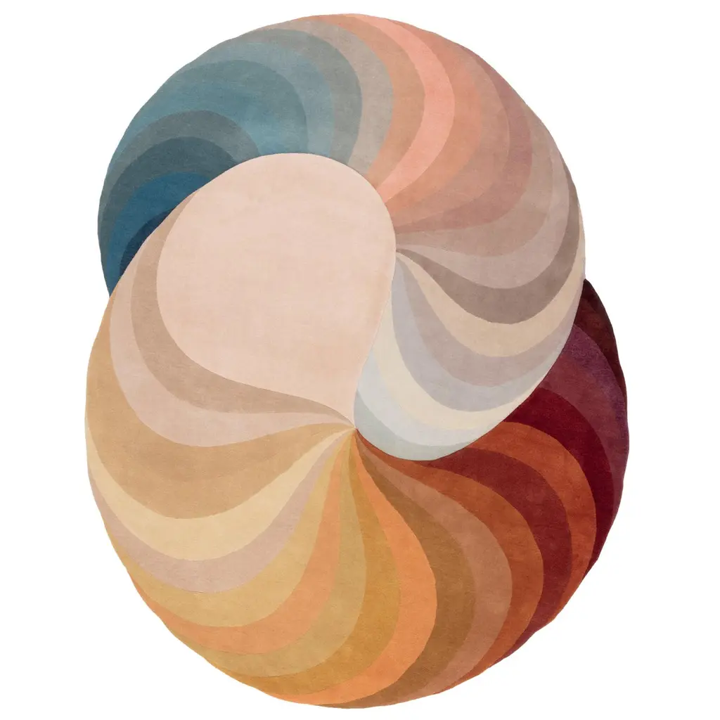Research which began with the Slinkie Collection for cc-tapis, Pipeline is the translation of Urquiola’s digital artworks into an artisanal product. A series of connected tubes emerge from the surface of the rug and create a labyrinth of color whose volume gives a sense of depth to the rug. Multiple chromatic evolutions that develop through circular movements, overlapping on different levels of Himalayan wool, focusing the gaze on the space outlined by the tubes.