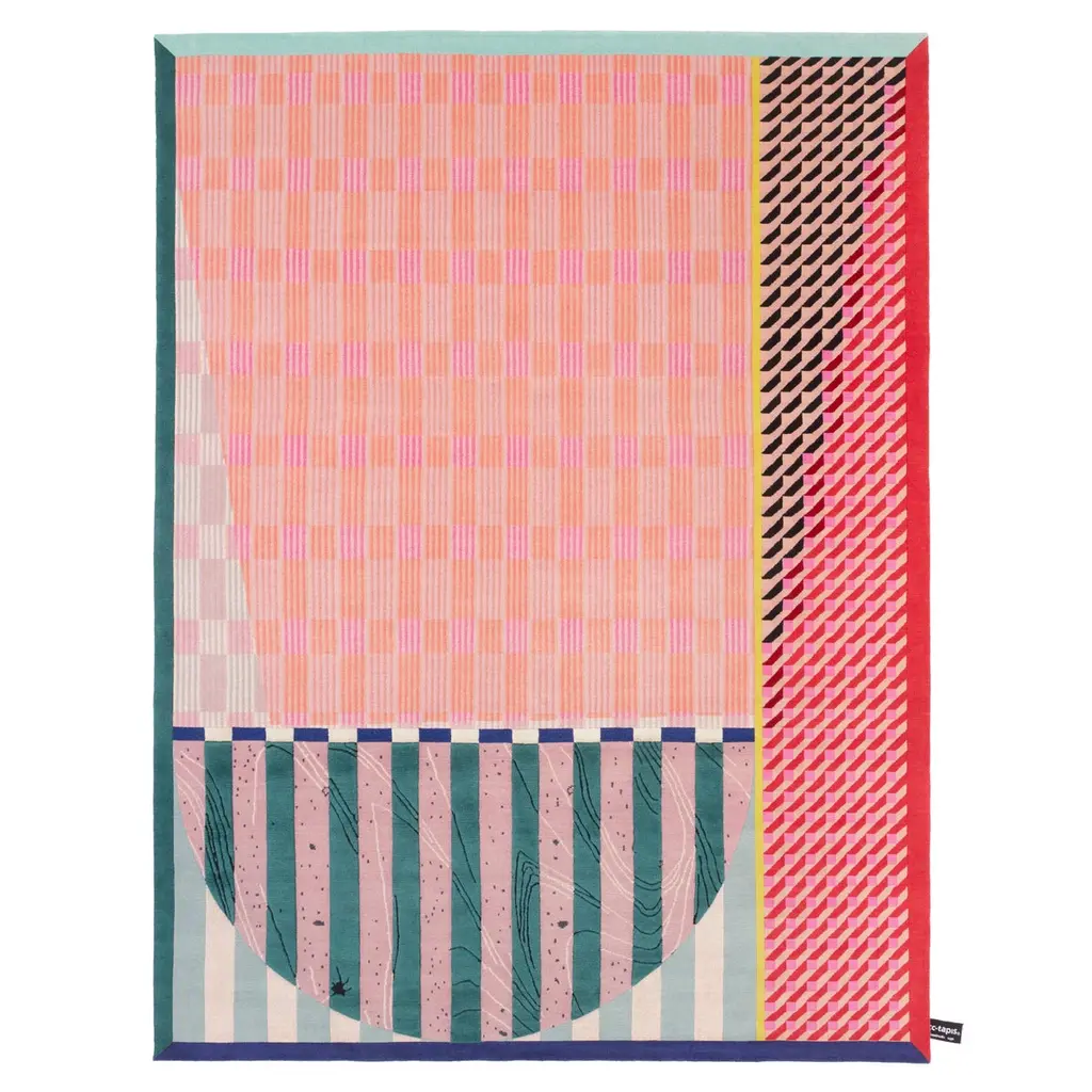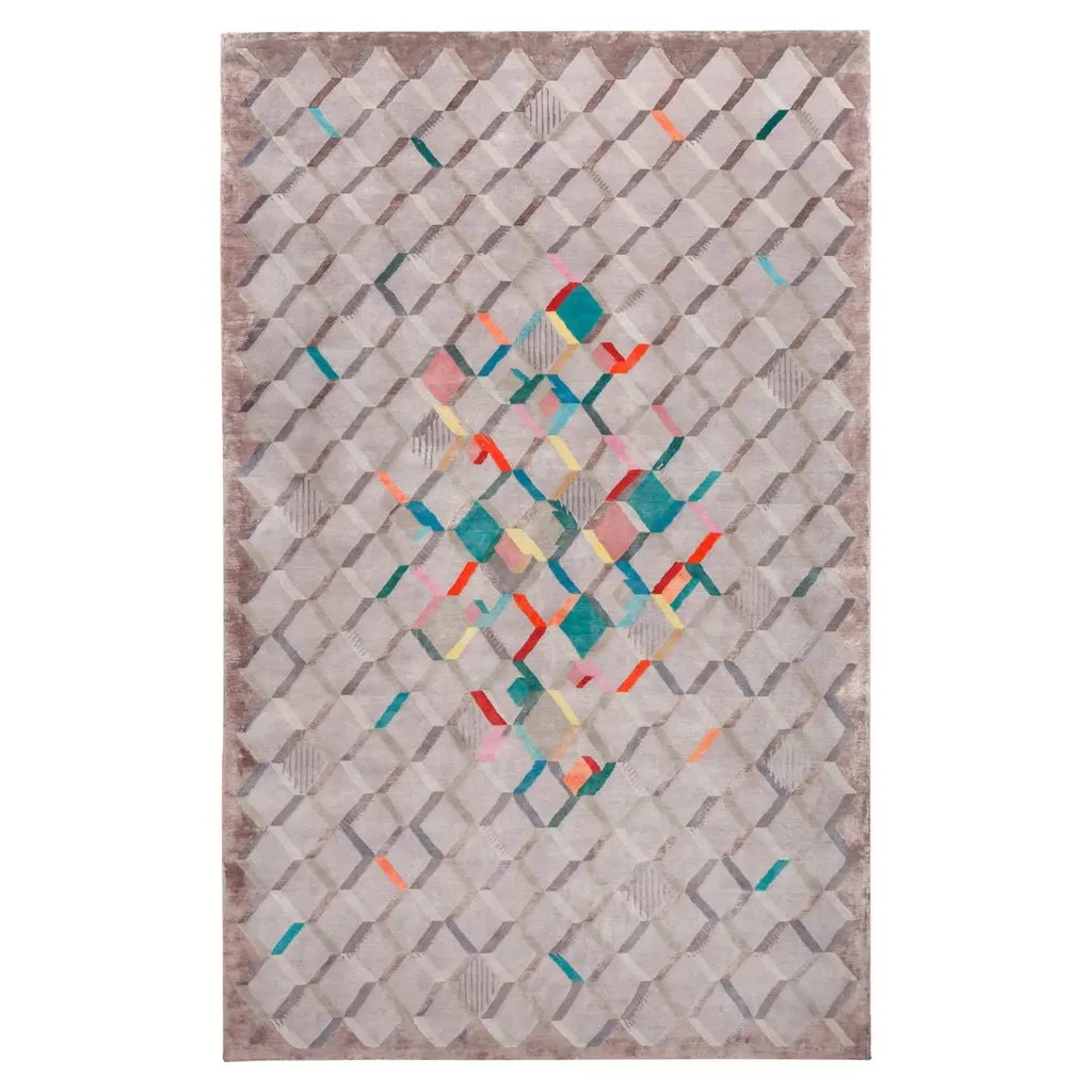 Hand knotted in the cc-tapis atelier in Kathmandu, Nepal. The rug is made with a cotton weave, Himalayan wool and pure silk coming from the areas surrounding the atelier. 152.000 individual knots per square meter approximately. The sale of every rug supports cc-foreducation. Size: 7.5' x 9.8' ft. A+ (152.000 knots/sqm approx.) The One and The Other are inspired by various materials of the physical world that have opposing characteristics of fibre or textile with which they are paired. This collection is an abstract representation of the concept of unique worlds colliding and coexisting on one surface. Additionally, it is a celebration of color and pattern: a positive stimulation of the senses.