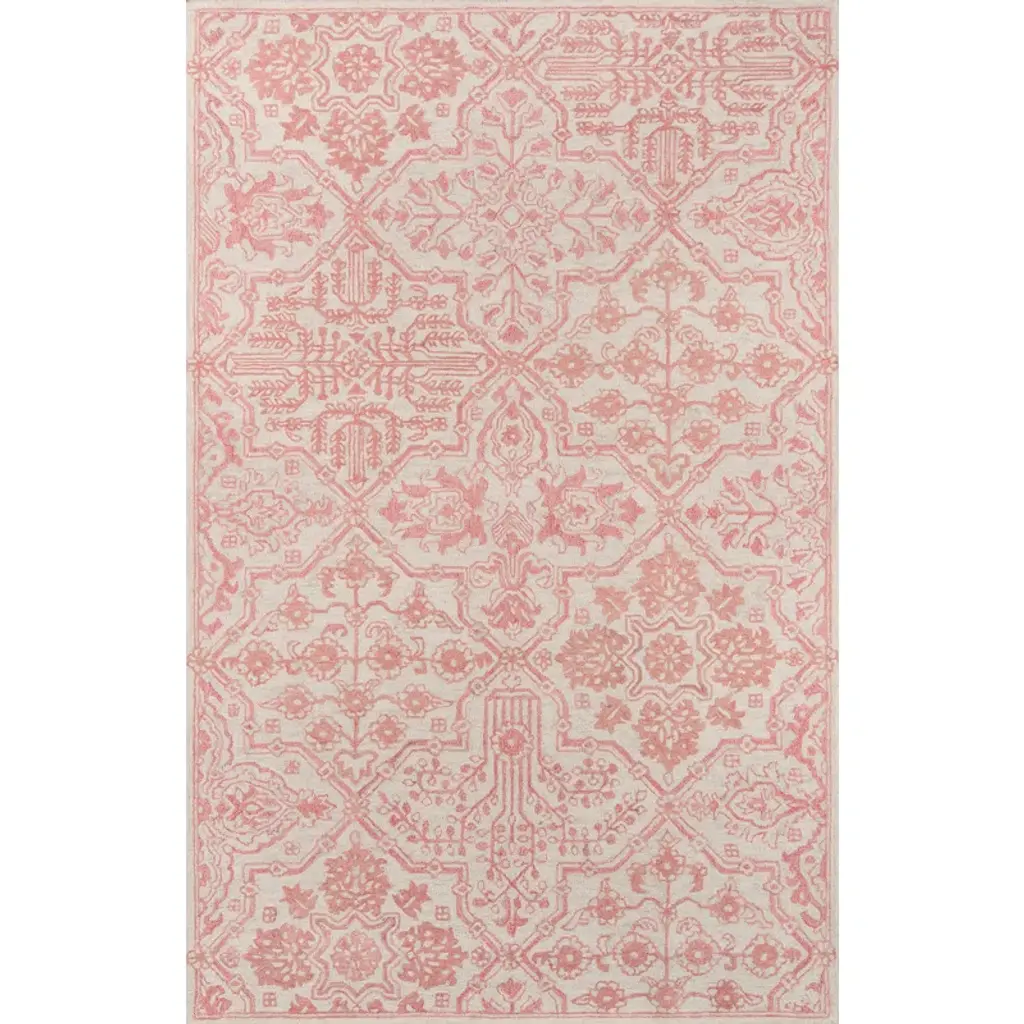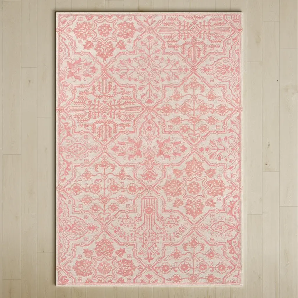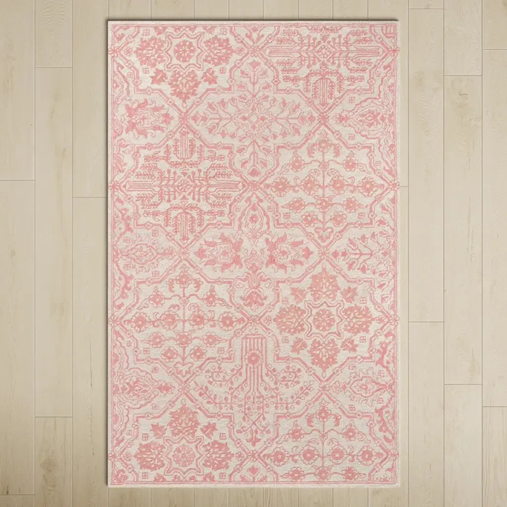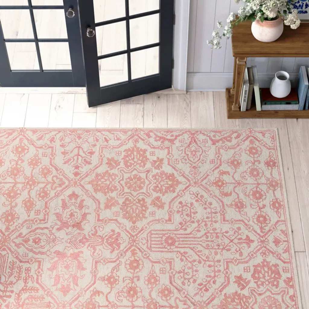 This wool area rug has a Persian-inspired geometric pattern in pink and ivory hues that easily works with both traditional and farmhouse decors. Hand-tufted in India from 100% wool, it has a thick 0.75" pile height that adds cushion and coziness to your living room, bedroom, or entryway. Choose from a variety of sizes to find the right fit for your room. Although this rug comes with a reinforced canvas-latex backing, we recommend pairing it with a rug pad to prevent shifting.