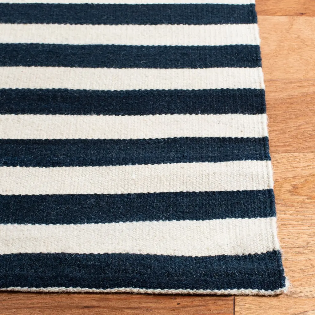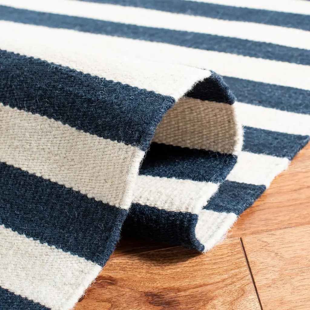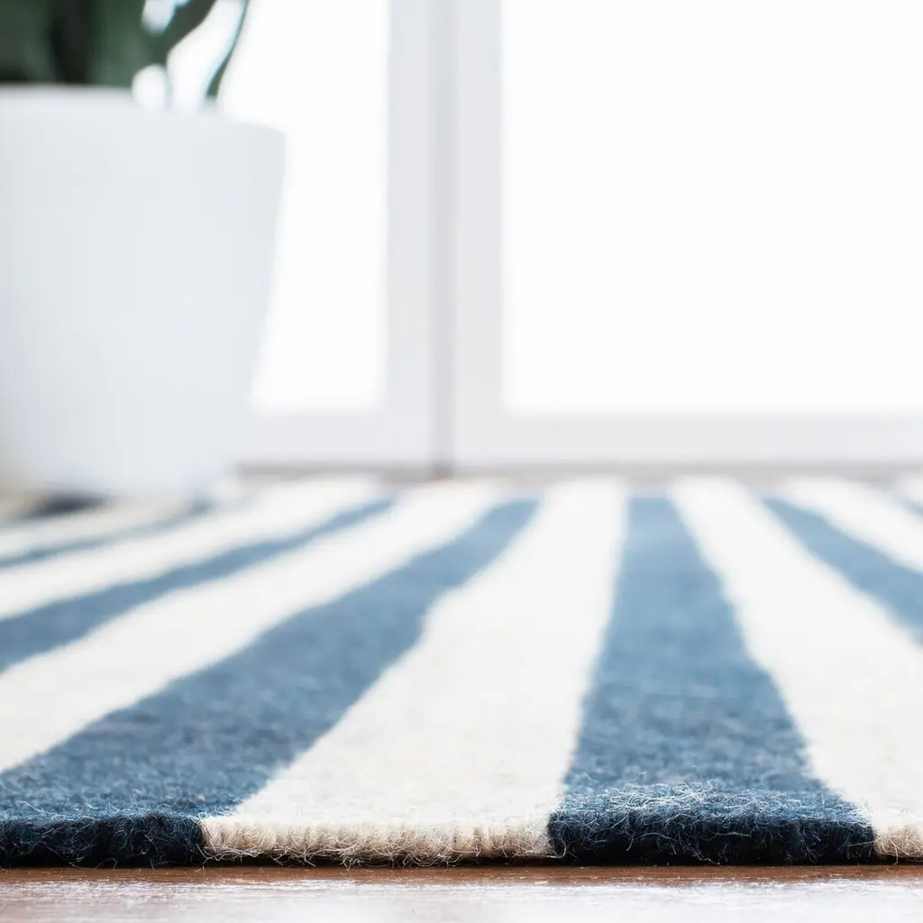 Introducing our serene sky-inspired area rug, perfectly sized at a modest 4 feet by 6 feet, designed to infuse a touch of tranquility into your living space. This small rectangle rug, with a subtle height of 1/4 inch, boasts a hand-woven construction that adds a personal touch to its craftsmanship. Meticulously made in India, this piece is a testament to the timeless skill of local artisans. Crafted from high-quality wool, the rug's durability is as impressive as its softness underfoot, ensuring both comfort and longevity. The rug's design features an elegant pattern of horizontal stripes, reminiscent of the calmness and expansiveness of the sky. The varying shades of blue stripes dance across a light canvas, creating a visual rhythm that is soothing and sophisticated. With its hand-woven technique and woolen texture, this rug promises not only style but also a conscientious choice for those who appreciate the human touch in their home decor. Whether gracing your living room, study, or bedroom, this sky-hued area rug is a breath of fresh air for any interior.