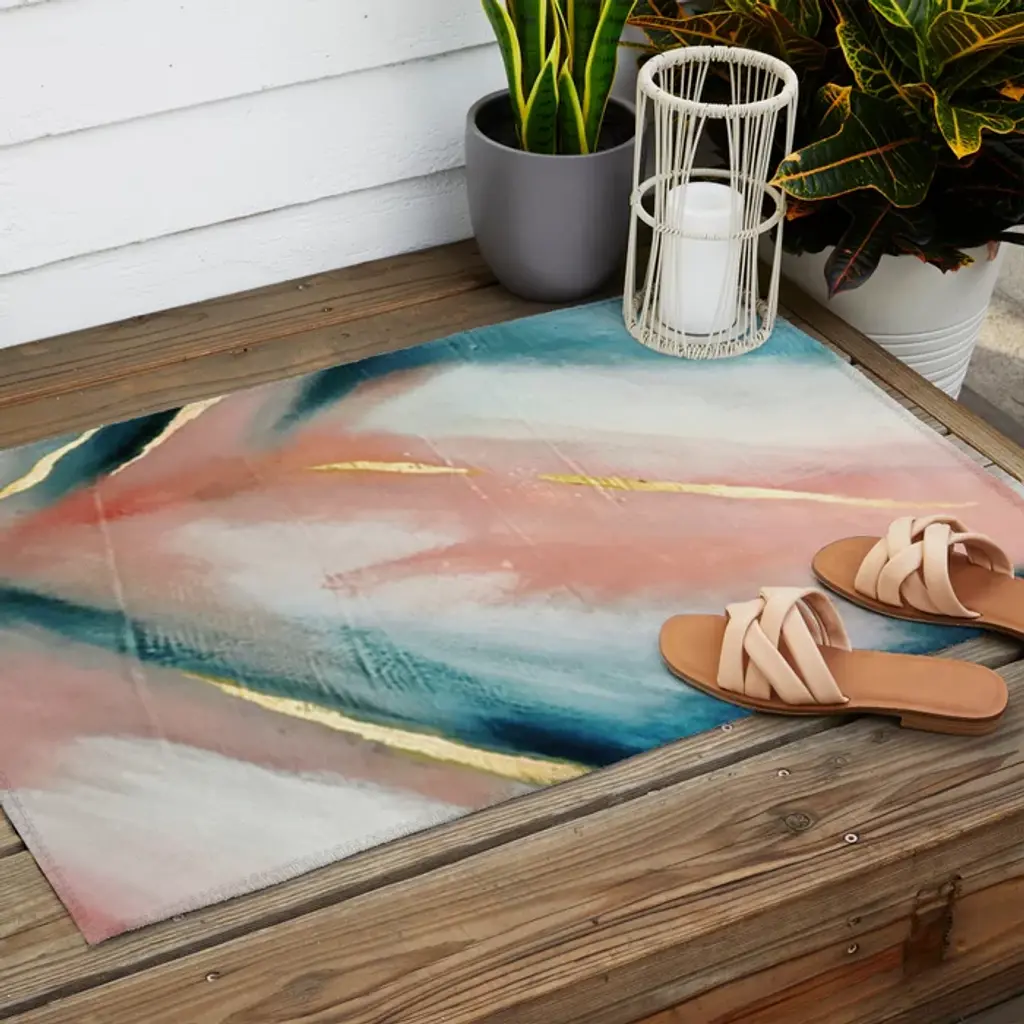 Celestial [3]: A Minimal Abstract Mixed-Media Piece In Pink, Blue, And Gold By Alyssa Hamilton Art Outdoor Rug