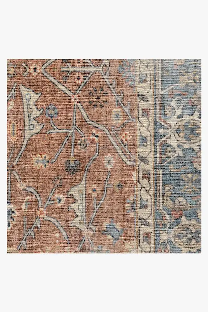 Celestine Coral Rug features a classic floral theme in playful coral and blue hues. Its vintage inspired design mimics an intricate floral vine lattice panel with a bordered grid-like pattern completed with a beautifully distressed texture.