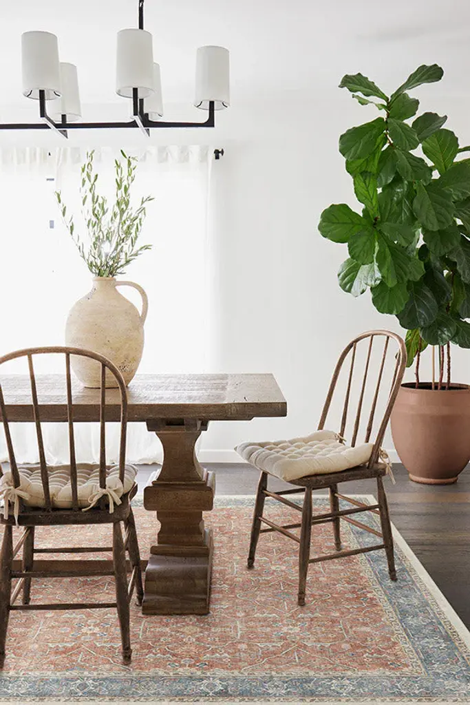 Celestine Coral Rug features a classic floral theme in playful coral and blue hues. Its vintage inspired design mimics an intricate floral vine lattice panel with a bordered grid-like pattern completed with a beautifully distressed texture. Water-resistant, stain-resistant, and machine-washable. Rug colors may vary slightly according to your device and the lighting in your space.