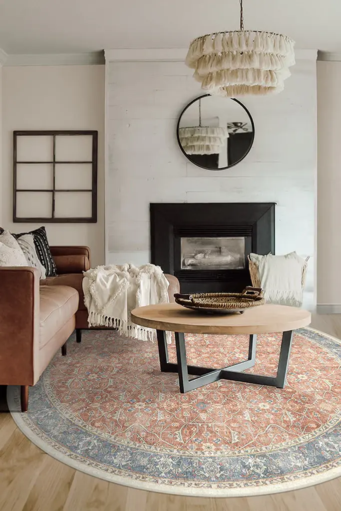 Celestine Coral Rug features a classic floral theme in playful coral and blue hues. Its vintage inspired design mimics an intricate floral vine lattice panel with a bordered grid-like pattern completed with a beautifully distressed texture.