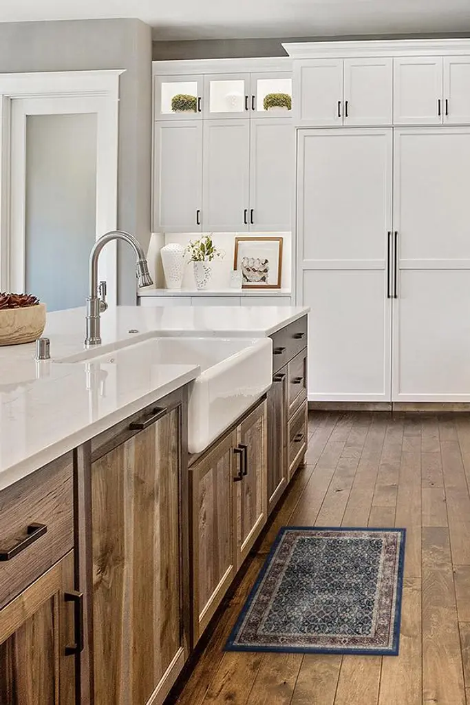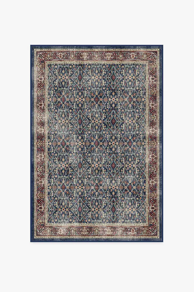 Celestine Sapphire Blue Rug features a rich jewel tone with a whimsical floral design. Intricate floral vines crawl through it mimicking a lattice panel, while its distressed palette of sapphire blue and vintage red gives it an ethereal look. Water-resistant, stain-resistant, and machine-washable.