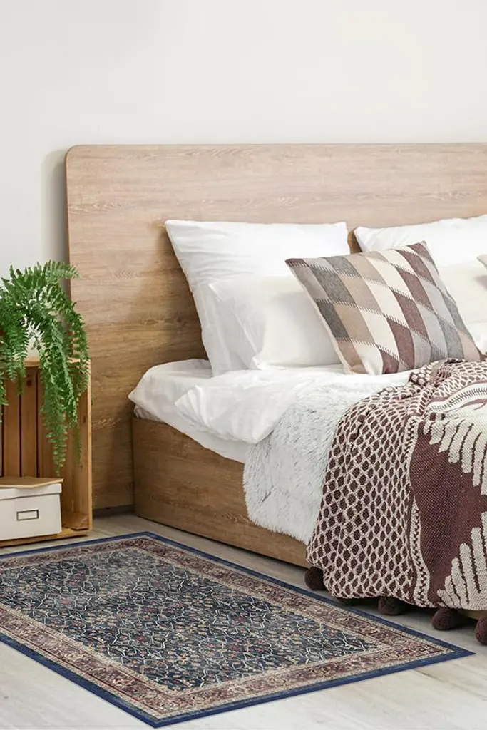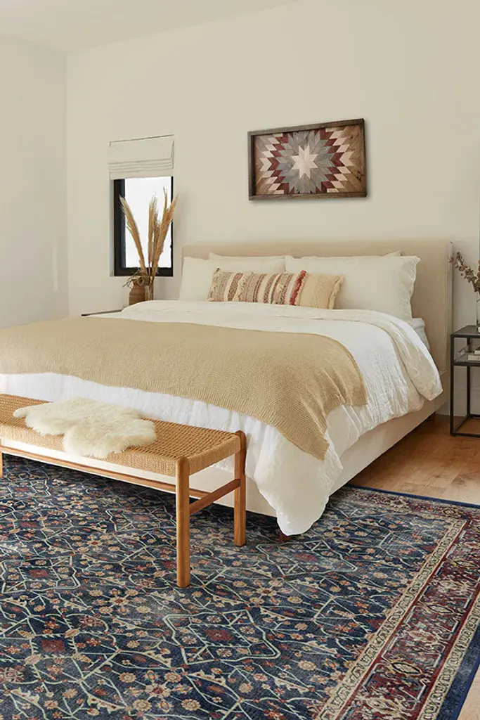 Celestine Sapphire Blue Rug features a rich jewel tone with a whimsical floral design. Intricate floral vines crawl through it mimicking a lattice panel, while its distressed palette of sapphire blue and vintage red gives it an ethereal look. Water-resistant, stain-resistant, and machine-washable.