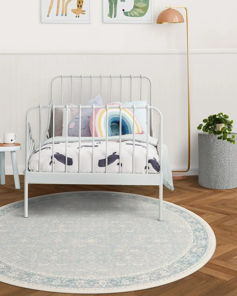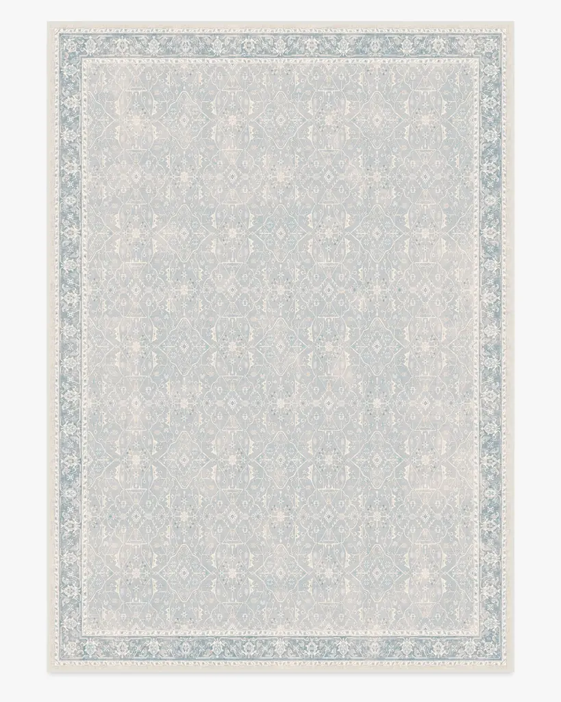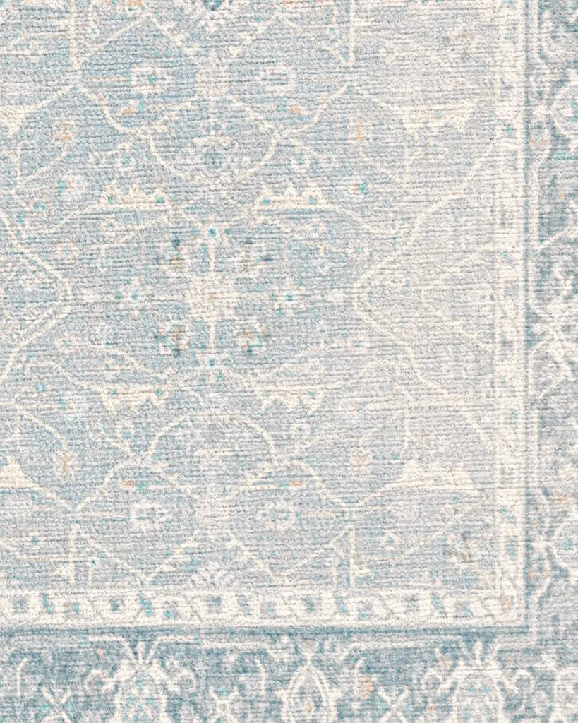 Dream in blue. Our vintage-inspired Celestine Soft Blue Rug exudes soothing blue pops of color with hints of coral and a warm fog undertone. The whimsical floral theme sparks happiness with its intricate flowering vine lattice panel design. Water-resistant, stain-resistant, and machine-washable.