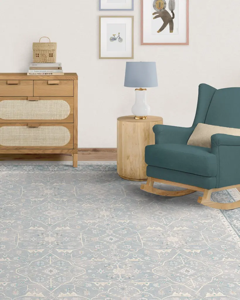 Dream in blue. Our vintage-inspired Celestine Soft Blue Rug exudes soothing blue pops of color with hints of coral and a warm fog undertone. The whimsical floral theme sparks happiness with its intricate flowering vine lattice panel design. Water-resistant, stain-resistant, and machine-washable.