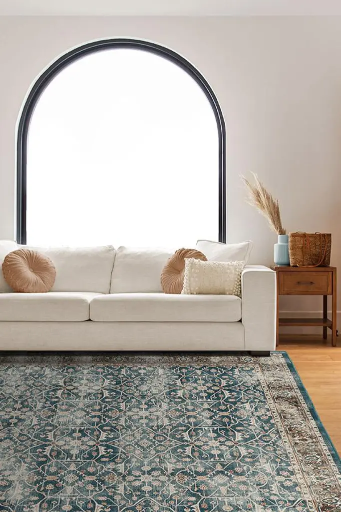Celestine Teal Blue Rug gives off a celestial vibe with its whimsical floral theme. Designed to look like a lattice panel, this rug features a slim border and a large field of floral vines crawling through a grid-like pattern. Its palette of teal blue and coral orange is slightly distressed to give it a modern vintage feel.