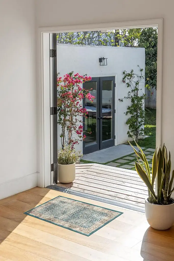 Celestine Teal Blue Rug gives off a celestial vibe with its whimsical floral theme. Designed to look like a lattice panel, this rug features a slim border and a large field of floral vines crawling through a grid-like pattern. Its palette of teal blue and coral orange is slightly distressed to give it a modern vintage feel.