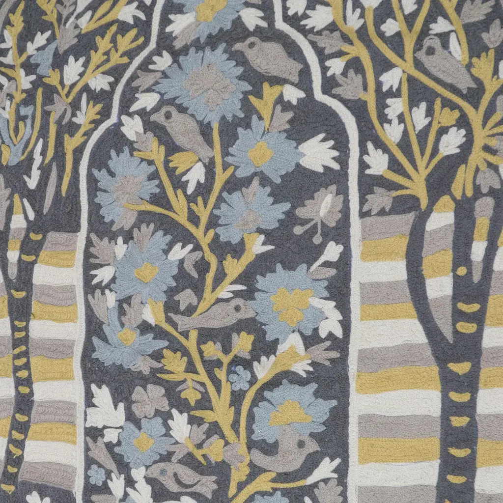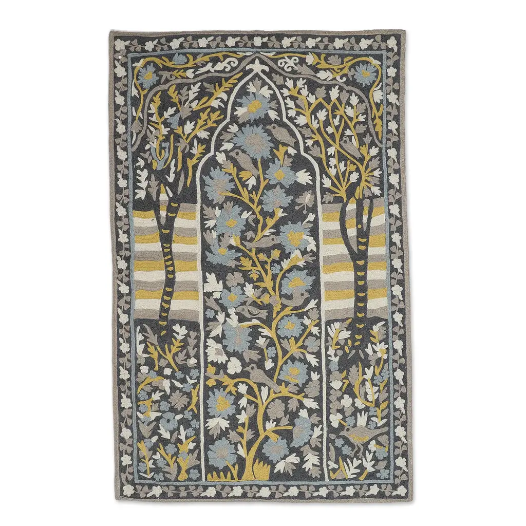 Decorate your hardwood floors with this beautiful rug designed by India's Amit Moza. Crafted on a hand-woven cotton base, the rug features chain stitched wool embroidery work in a tree and bird motif. The artisan includes three loops on the back, allowing the rug to double as a wall hanging.
