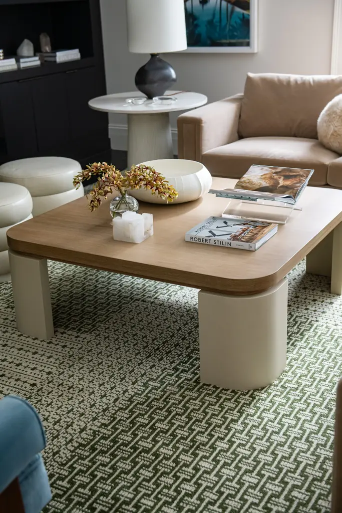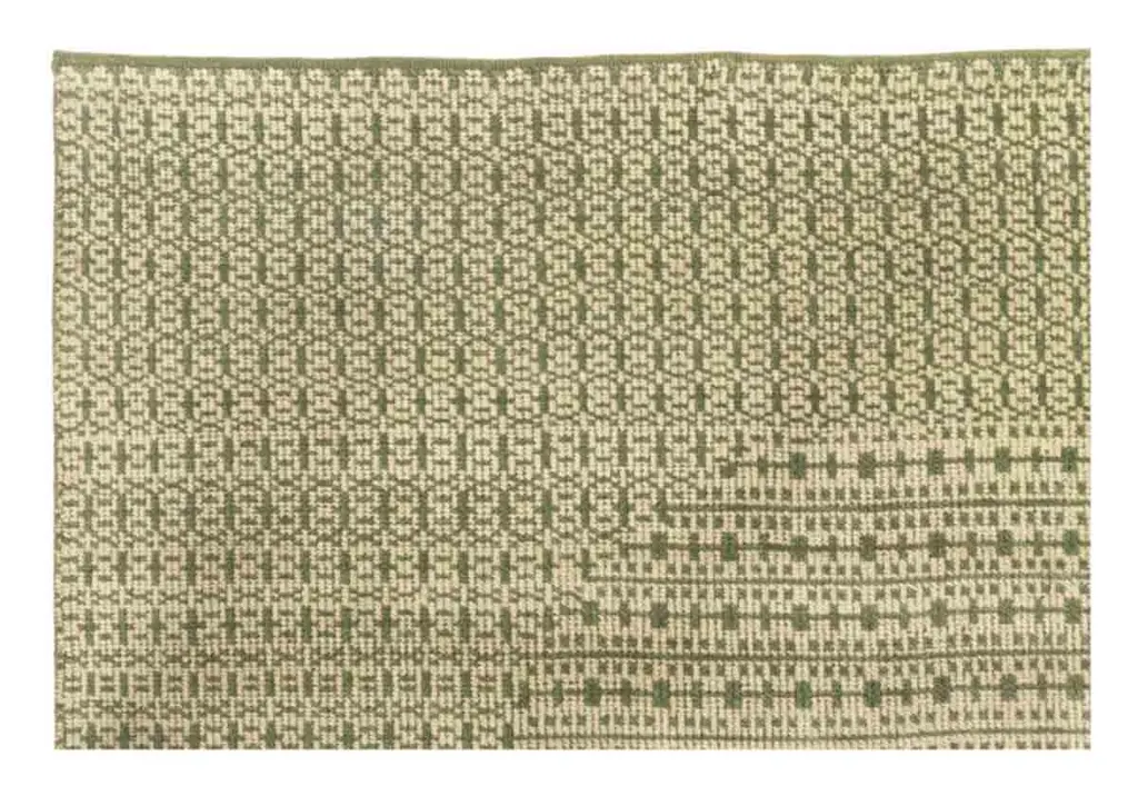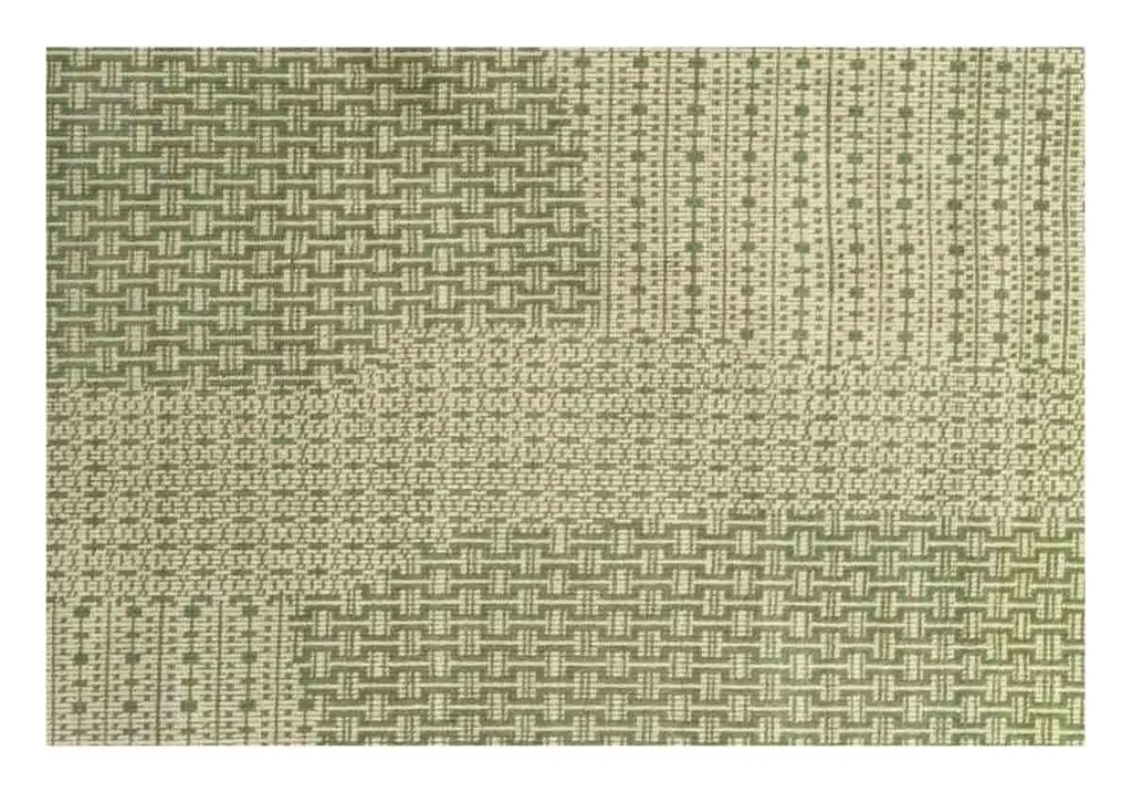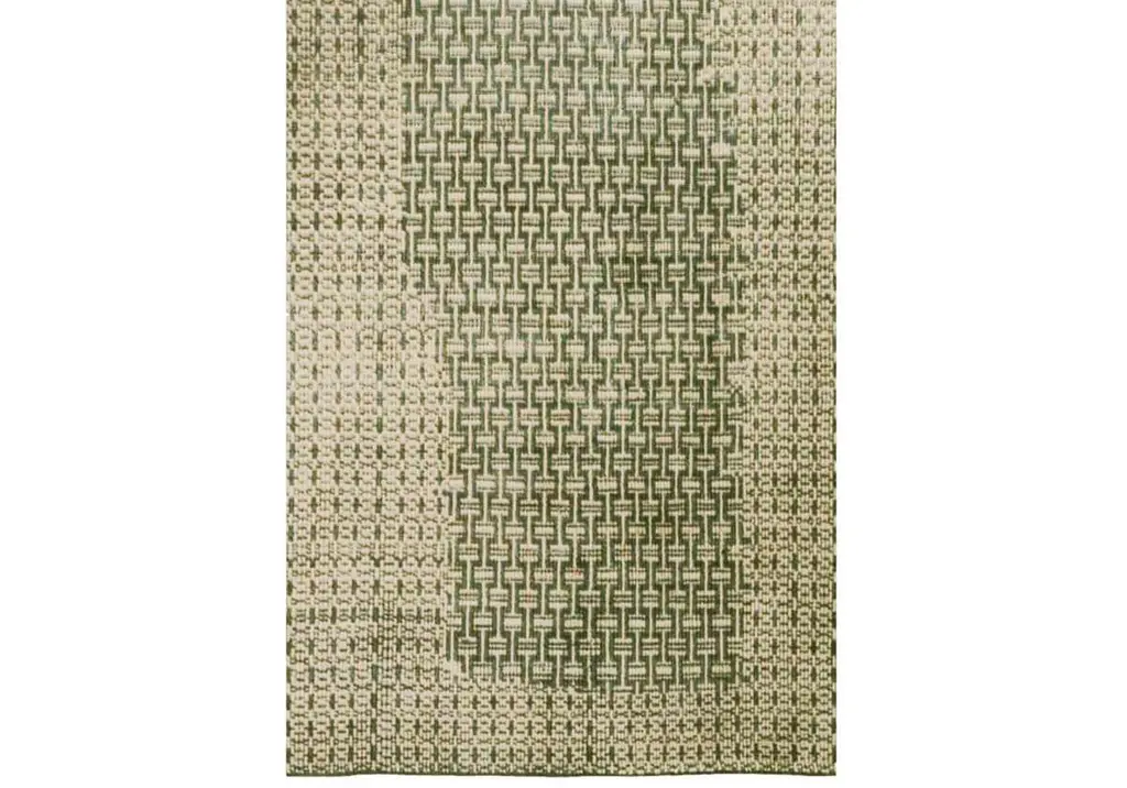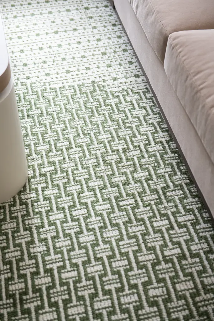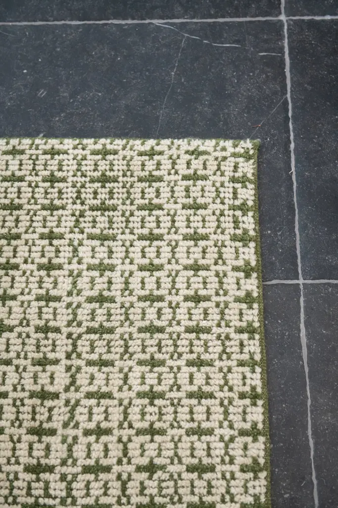 The Chainmail Rug is a must-have with its intricate, interlocking palm green tone on a neutral biscuit colored field. Incredibly versatile, it looks great in offices, living rooms, under dining tables, and even melts beautifully into bedroom scenes adding visual texture and dimension.