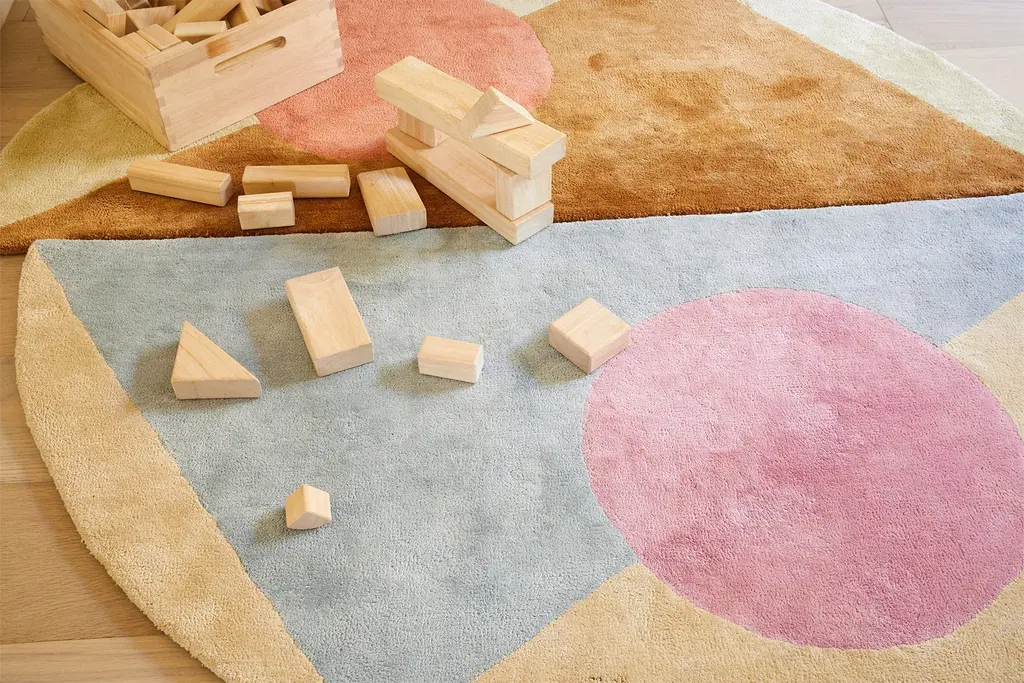We used remarkably soft OEKO-TEX certified cotton for safety and sturdiness. Sustainably made and rigorously tested, its fibers are guaranteed to be healthier for tummy time. Hand-tufting allowed us to more easily make the kinds of shapes we wanted, and a vintage Southern California palette of candy pinks and blues feels both bright and sun-faded.