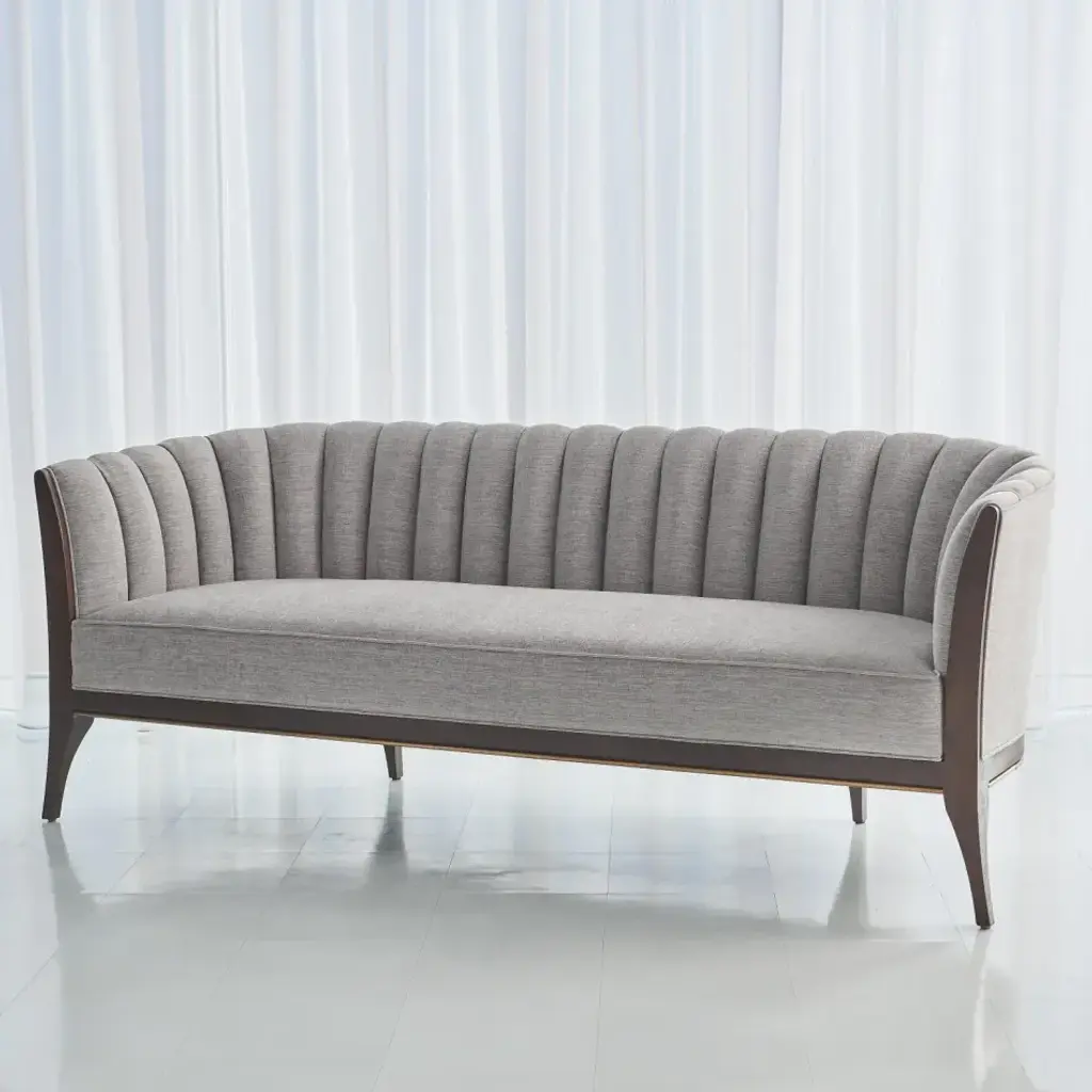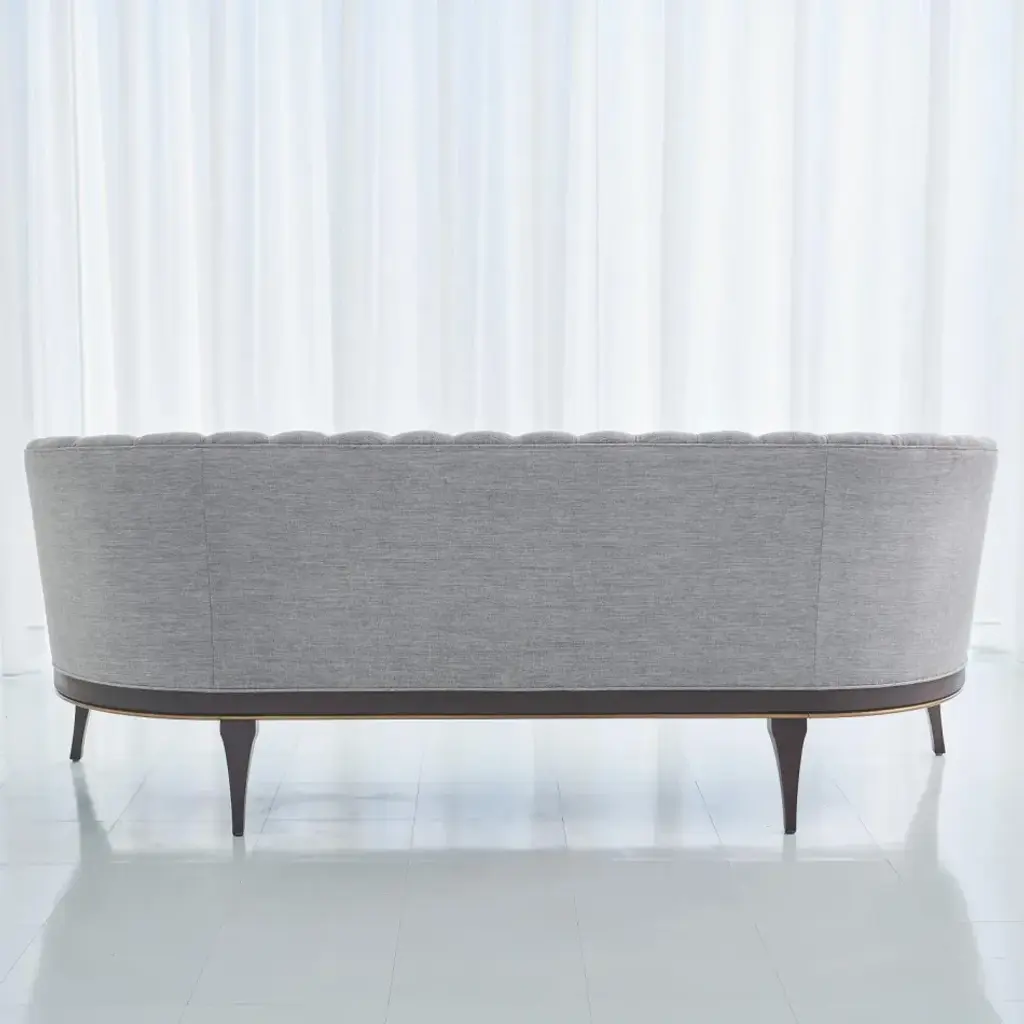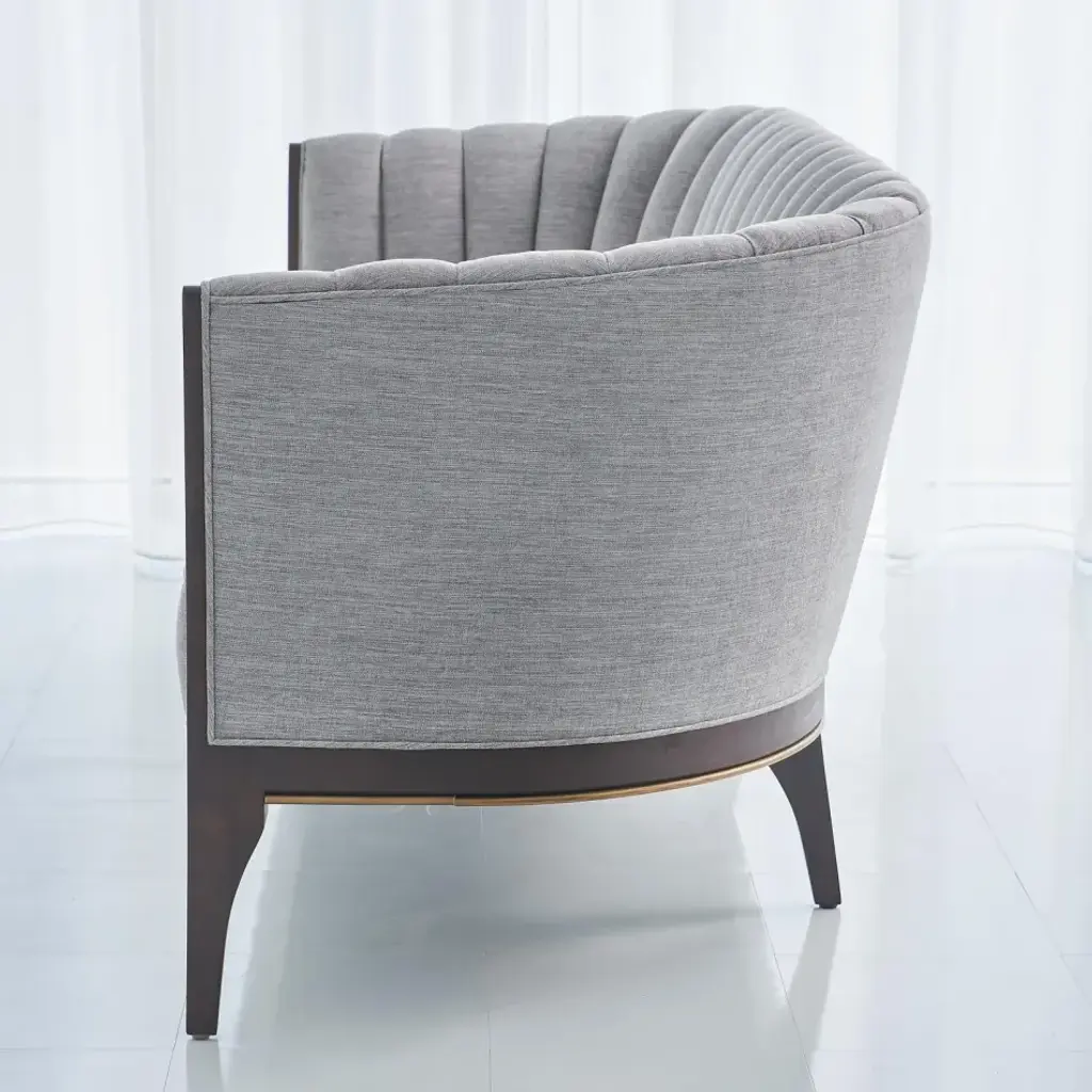 Custom designed by George Sellers, our Channel Back sofa is distinguished by deep channels of stitched, 100% polyester, Silversmith fabric around the back support. A beautiful wooden base supports the sofa and is accentuated along the bottom edge with a filet of solid brass running around the entire frame of the sofa. Elegant shapely legs and frame are finished in a dark waxed oiled walnut finish. Another distinct characteristic of this sofa is the arching back shape, as elegant and visually beautiful from the front or from a back view. From a fashion forward perspective, Global Views offers accessories, furniture, statement lighting, and an assortment of rugs and mirrors to add beauty and joy to your home.