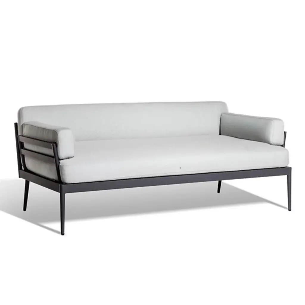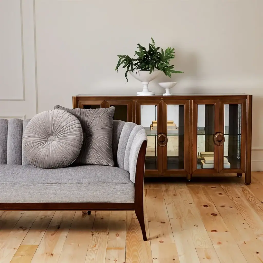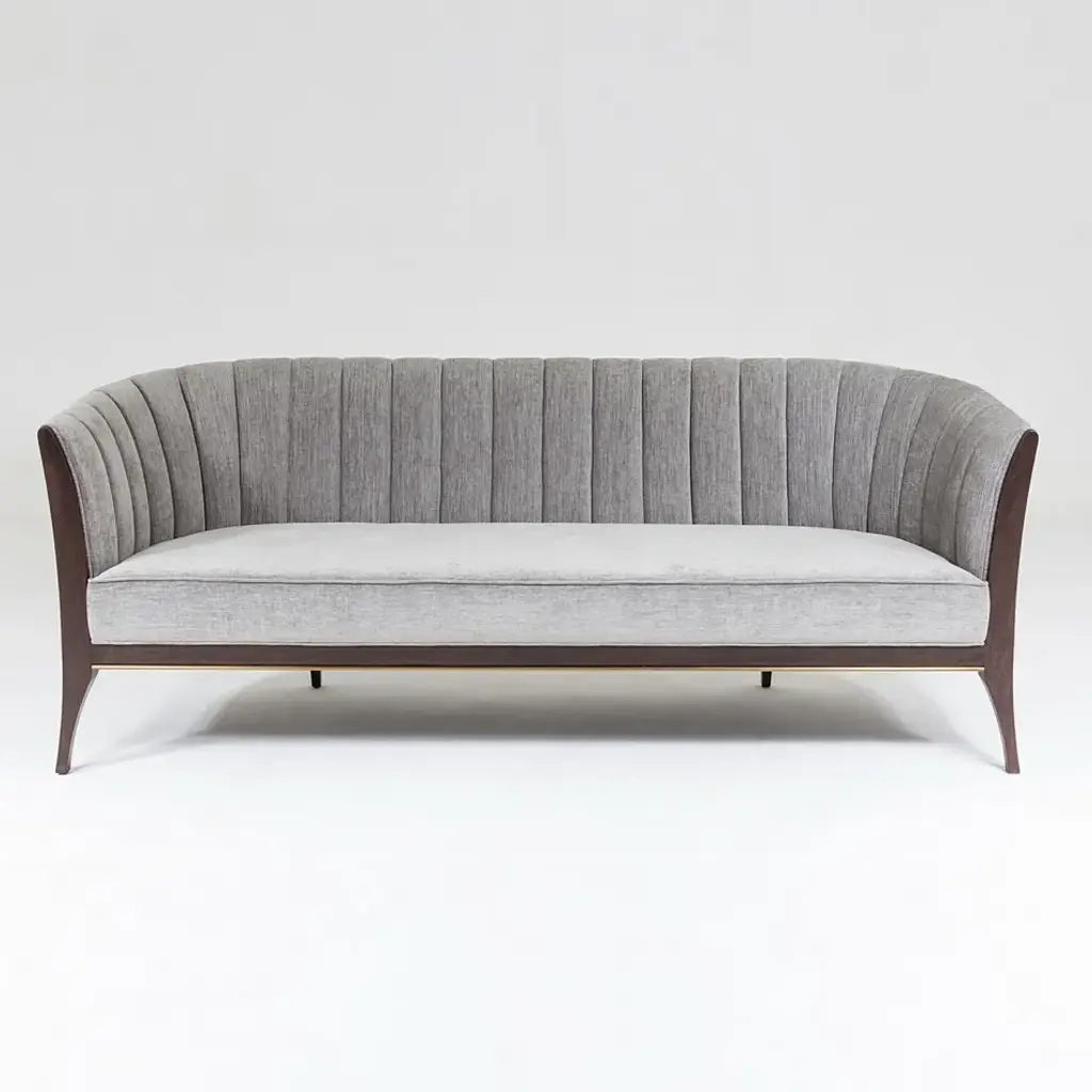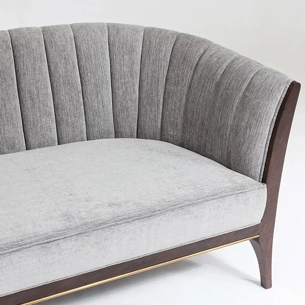 Custom designed by George Sellers, our Channel Back sofa is distinguished by deep channels of stitched, 100% polyester, Silversmith fabric around the back support. A beautiful wooden base supports the sofa and is accentuated along the bottom edge with a filet of solid brass running around the entire frame of the sofa. Elegant shapely legs and frame are finished in a dark waxed oiled walnut finish. Another distinct characteristic of this sofa is the arching back shape, as elegant and visually beautiful from the front or from a back view. From a fashion forward perspective, Global Views offers accessories, furniture, statement lighting, and an assortment of rugs and mirrors to add beauty and joy to your home.