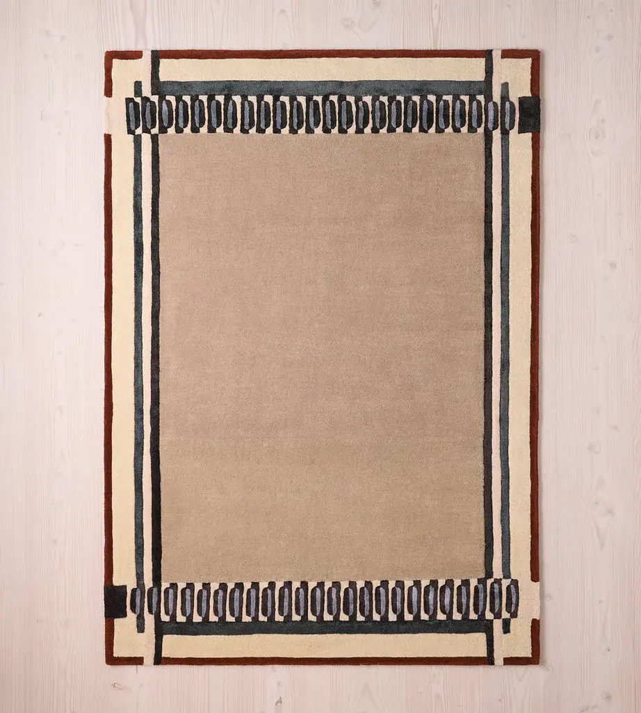 Hand-tufted from a tactile New Zealand wool blend to create a geometric border design. The Chapman rug combines a warm, neutral base with a patterned border in deep greens and blues, inspired by the bold colours and geometric patterns seen throughout Soho Warehouse in Downtown LA. The border can help to define the layout of your space, such as layering under a dining table or in the centre of your living space.