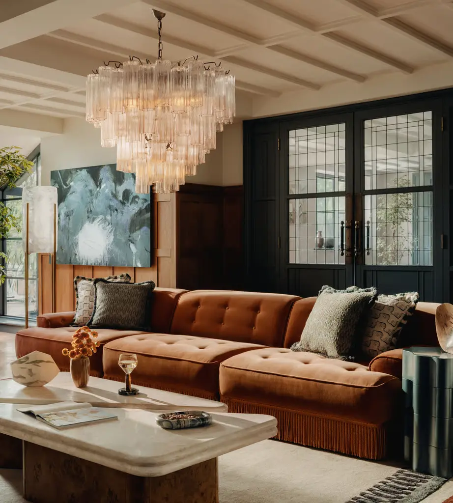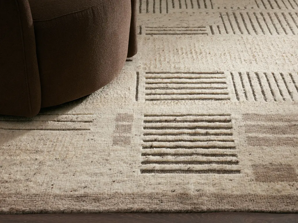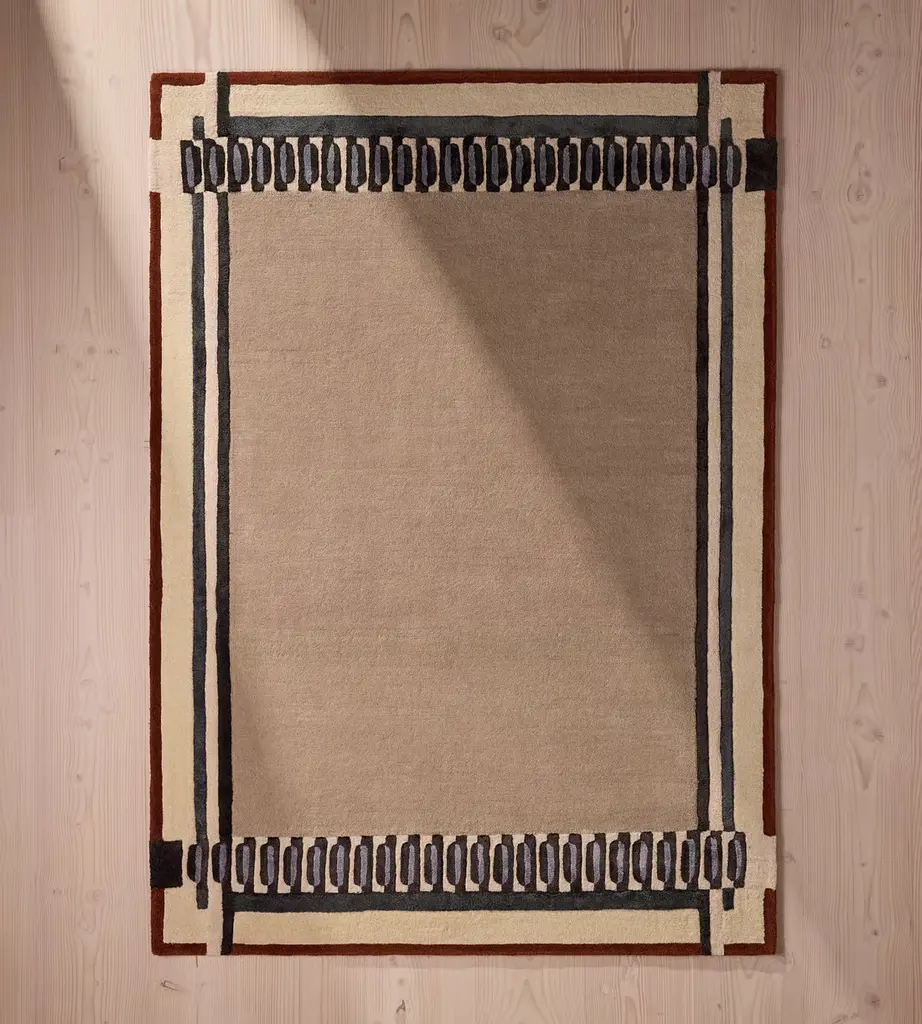 Hand-tufted from a tactile New Zealand wool blend to create a geometric border design. The Chapman rug combines a warm, neutral base with a patterned border in deep greens and blues, inspired by the bold colours and geometric patterns seen throughout Soho Warehouse in Downtown LA. The border can help to define the layout of your space, such as layering under a dining table or in the centre of your living space.
