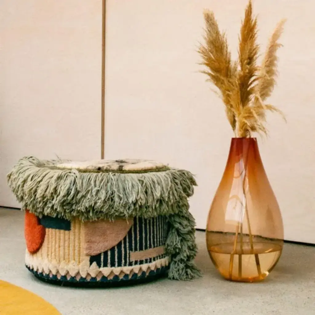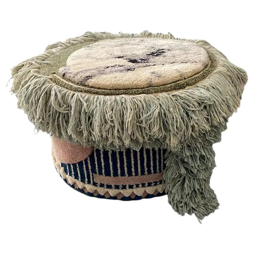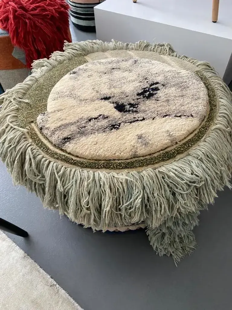 Pouf Charaktere Sybille by Lyk Rug Dimensions: Ø 62 x H 48 cm Materials: 100% tibetan highland-wool, new pure hand-combed and hand-spun wool, natural vegetable-dyed wool, 100 knots per square inch. Hand-knotted, manual techniques and pot-dying makes every Lyk Rug unique, slight variations in size & tone is possible.