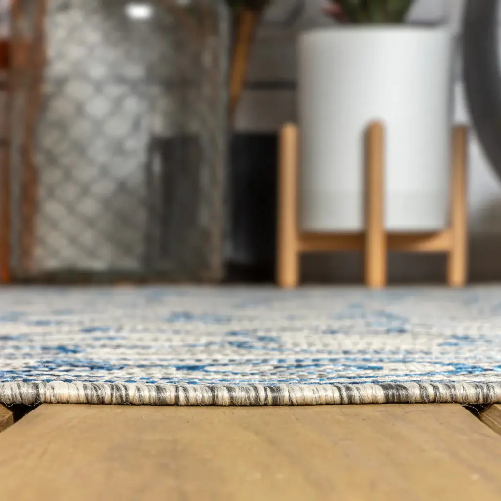 With a filigree design reminiscent of antique iron gates, our Boho-chic rug adds eclectic style to an outdoor porch or patio. Varied tones of gray and ivory mingled with a navy blue pattern give this rug a hand-woven, vintage vibe. The flatweave design is great for high-traffic spaces indoors too. Features:• Flat-weave construction of 100% polypropylene• Light gray and navy blue with a handwoven mingled texture• Water resistance with 0.19" pile• 100% Polypropylene• No backing, use of rug pad is recommended (sold separately)• Power-loomed in Turkey• Actual Dimension: 2 ft. 2 in. X 10 ft.• Color: Gray/Navy• Thickness measures: 0.19 in.• Available in multiple sizes and/or colorsRug Care:• Durable and easy-care - just sweep or hose down with mild soap and water• Packing and shipping may cause temporary creases in rugs, which will flatten out after a week on the floor; to expedite the process, try back-rolling your rug before laying it down, and then allow ample time for the remaining creases to relax• Please Note: Due to differences in monitors, some rug colors may vary slightly. Lengths and widths may vary from the published dimensions. Patterns may vary slightly according to the shape and size selected.About us:Style your floors with JONATHAN Y. By combining fine craftsmanship and design, this New York creative studio is bringing fashion to your floors. The collection mixes sustainable organic materials, vibrant colors and trend-worthy styles to create JONATHAN Y''s distinctive catalog of rugs.