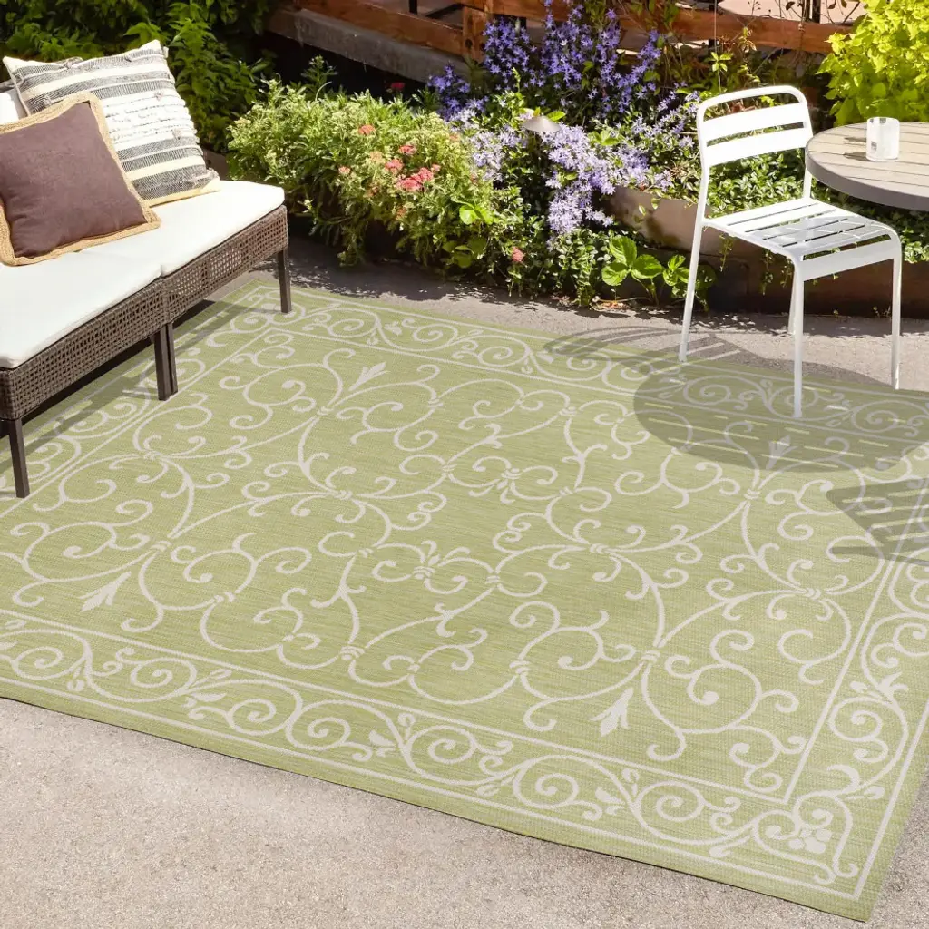 With a filigree design reminiscent of antique iron gates, our Boho-chic rug adds eclectic style to an outdoor porch or patio. Varied tones of soft green mingled with a cream pattern give this rug a hand-woven, vintage vibe. The flatweave design is great for high-traffic spaces indoors too.Features:• Flat-weave construction of 100% polypropylene• Soft green and cream with a handwoven mingled texture• Water resistance with 0.19" pile• 100% Polypropylene• No backing, use of rug pad is recommended (sold separately)• Power Loomed in Turkey• Actual Dimension: 3 ft. 11 in. x 6 ft.• Color: Green/Cream• Thickness measures: 0.19 in.• Available in multiple sizes and/or colorsRug Care:• Vacuum regularly and spot clean as needed; avoid direct and continuous exposure to sunlight; use brushless vacuum; remove spills immediately; if liquid, blot with clean, undyed cloth by pressing firmly around the spill to absorb as much as possible; for hard to remove stains, professional rug cleaning is recommended; store in a dry, well ventilated area and rotate for consistent wear• Packing and shipping may cause temporary creases in rugs, which will flatten out after a week on the floor; to expedite the process, try back-rolling your rug before laying it down, and then allow ample time for the remaining creases to relax• Please Note: Due to differences in monitors, some rug colors may vary slightly. Lengths and widths may vary from the published dimensions. Patterns may vary slightly according to shape and size selected.About us:Style your floors with JONATHAN Y. By combining fine craftsmanship and design, this New York creative studio is bringing fashion to your floors. The collection mixes sustainable organic materials, vibrant colors and trend worthy styles to create JONATHAN Y''s distinctive catalog of rugs.