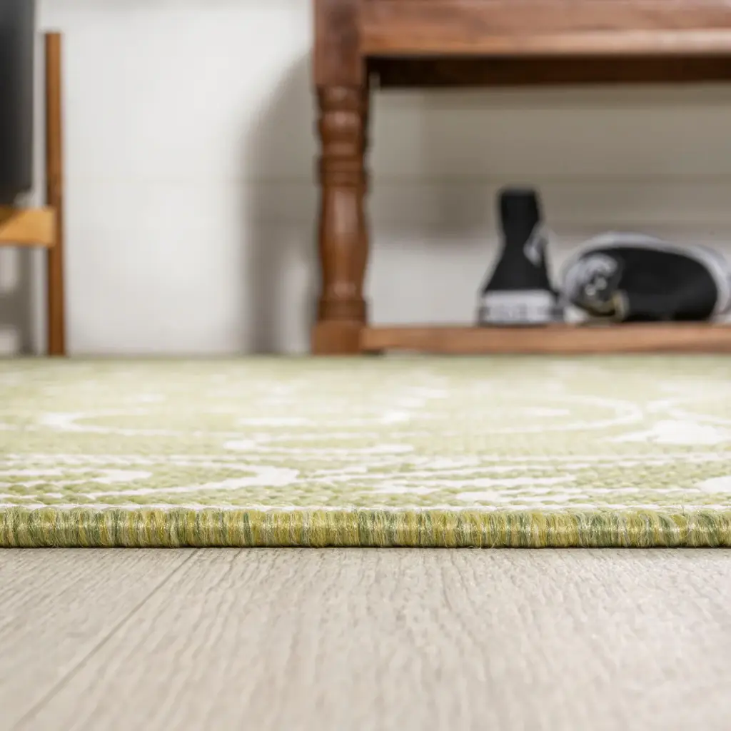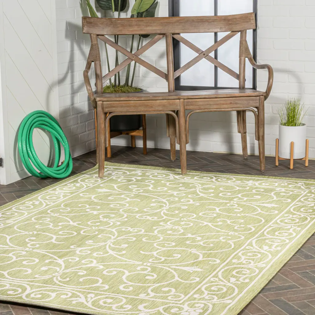 With a filigree design reminiscent of antique iron gates, our Boho-chic rug adds eclectic style to an outdoor porch or patio. Varied tones of soft green mingled with a cream pattern give this rug a hand-woven, vintage vibe. The flatweave design is great for high-traffic spaces indoors too.Features:• Flat-weave construction of 100% polypropylene• Soft green and cream with a handwoven mingled texture• Water resistance with 0.19" pile• 100% Polypropylene• No backing, use of rug pad is recommended (sold separately)• Power Loomed in Turkey• Actual Dimension: 9 ft. x 12 ft.• Color: Green/Cream• Thickness measures: 0.19 in.• Available in multiple sizes and/or colorsRug Care:• Vacuum regularly and spot clean as needed; avoid direct and continuous exposure to sunlight; use brushless vacuum; remove spills immediately; if liquid, blot with clean, undyed cloth by pressing firmly around the spill to absorb as much as possible; for hard to remove stains, professional rug cleaning is recommended; store in a dry, well ventilated area and rotate for consistent wear• Packing and shipping may cause temporary creases in rugs, which will flatten out after a week on the floor; to expedite the process, try back-rolling your rug before laying it down, and then allow ample time for the remaining creases to relax• Please Note: Due to differences in monitors, some rug colors may vary slightly. Lengths and widths may vary from the published dimensions. Patterns may vary slightly according to shape and size selected.About us:Style your floors with JONATHAN Y. By combining fine craftsmanship and design, this New York creative studio is bringing fashion to your floors. The collection mixes sustainable organic materials, vibrant colors and trend worthy styles to create JONATHAN Y''s distinctive catalog of rugs.