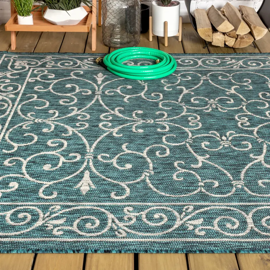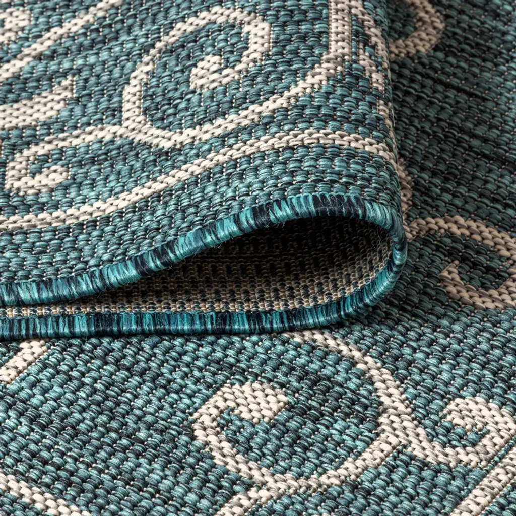 With a filigree design reminiscent of antique iron gates, our Boho-chic rug adds eclectic style to an outdoor porch or patio. Varied tones of teal and deep blue mingled with a gray pattern give this rug a hand-woven, vintage vibe. The flatweave design is great for high-traffic spaces indoors too. Features:• Flat-weave construction of 100% polypropylene• Teal blue and light gray with a handwoven mingled texture• Water resistance with 0.19" pile• 100% Polypropylene• No backing, use of rug pad is recommended (sold separately)• Power Loomed in Turkey• Actual Dimension: 7ft. 9 in. x 10 ft.• Color: Teal/Gray• Thickness measures: 0.19 in.• Available in multiple sizes and/or colorsRug Care:• Durable and easy-care - just sweep or hose down with mild soap and water• Packing and shipping may cause temporary creases in rugs, which will flatten out after a week on the floor; to expedite the process, try back-rolling your rug before laying it down, and then allow ample time for the remaining creases to relax• Please Note: Due to differences in monitors, some rug colors may vary slightly. Lengths and widths may vary from the published dimensions. Patterns may vary slightly according to shape and size selected.About us:Style your floors with JONATHAN Y. By combining fine craftsmanship and design, this New York creative studio is bringing fashion to your floors. The collection mixes sustainable organic materials, vibrant colors and trend worthy styles to create JONATHAN Y''s distinctive catalog of rugs.