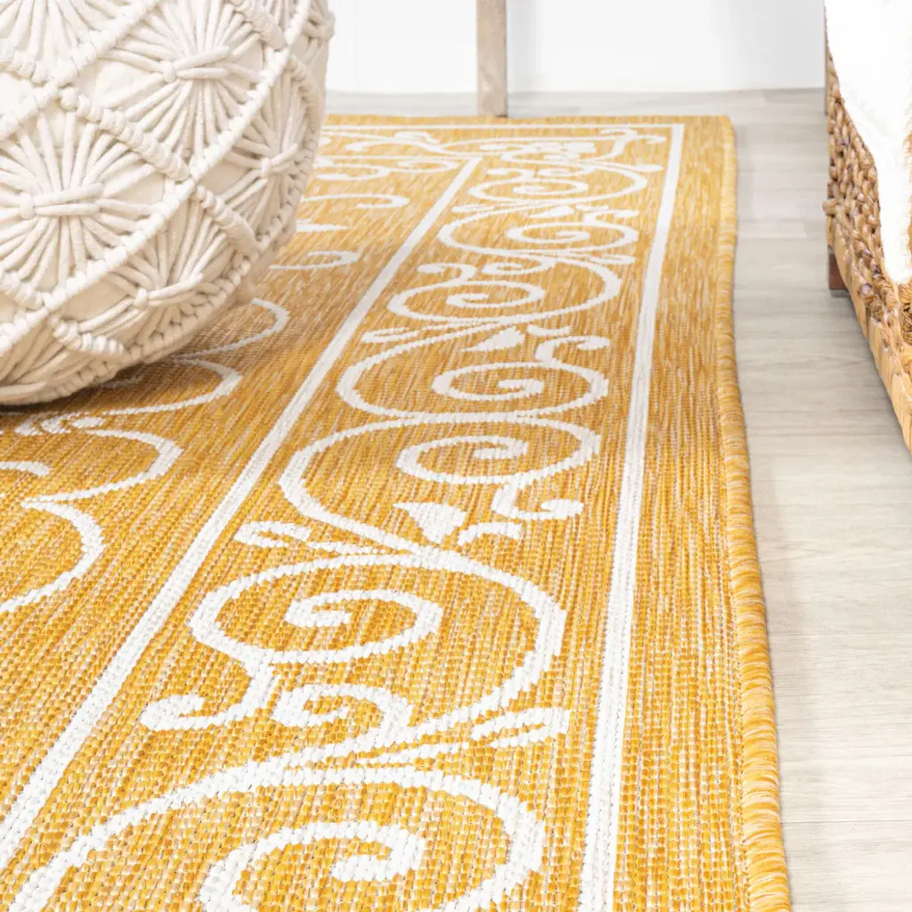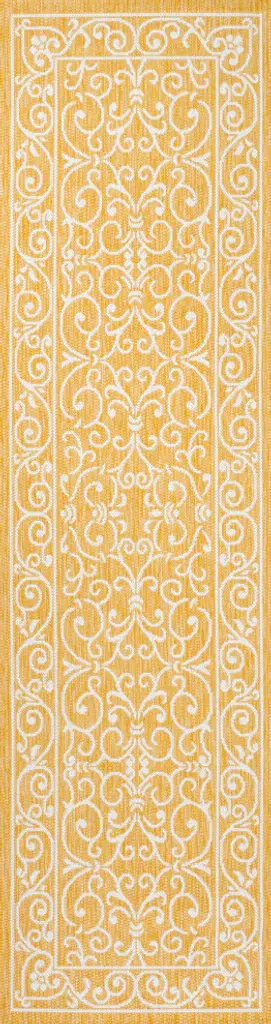 With a filigree design reminiscent of antique iron gates, our Boho-chic rug adds eclectic style to an outdoor porch or patio. Tones of cream mingled with a soft green pattern give this rug a hand-woven, vintage vibe. The flatweave design is great for high-traffic spaces indoors too.Features:• Water resistance with 0.19" pile• Soft green and cream with a handwoven mingled texture• Flat-weave construction of 100% polypropylene• 100% Polypropylene• No backing, use of rug pad is recommended (sold separately)• Power Loomed in Turkey• Actual Dimension: 2 ft. 2 in. x 8 ft.• Color: Yellow/Cream• Thickness measures: 0.19 in.• Available in multiple sizes and/or colorsRug Care:• Vacuum regularly and spot clean as needed; avoid direct and continuous exposure to sunlight; use brushless vacuum; remove spills immediately; if liquid, blot with clean, undyed cloth by pressing firmly around the spill to absorb as much as possible; for hard to remove stains, professional rug cleaning is recommended; store in a dry, well ventilated area and rotate for consistent wear• Packing and shipping may cause temporary creases in rugs, which will flatten out after a week on the floor; to expedite the process, try back-rolling your rug before laying it down, and then allow ample time for the remaining creases to relax• Please Note: Due to differences in monitors, some rug colors may vary slightly. Lengths and widths may vary from the published dimensions. Patterns may vary slightly according to shape and size selected.About us:Style your floors with JONATHAN Y. By combining fine craftsmanship and design, this New York creative studio is bringing fashion to your floors. The collection mixes sustainable organic materials, vibrant colors and trend worthy styles to create JONATHAN Y''s distinctive catalog of rugs.