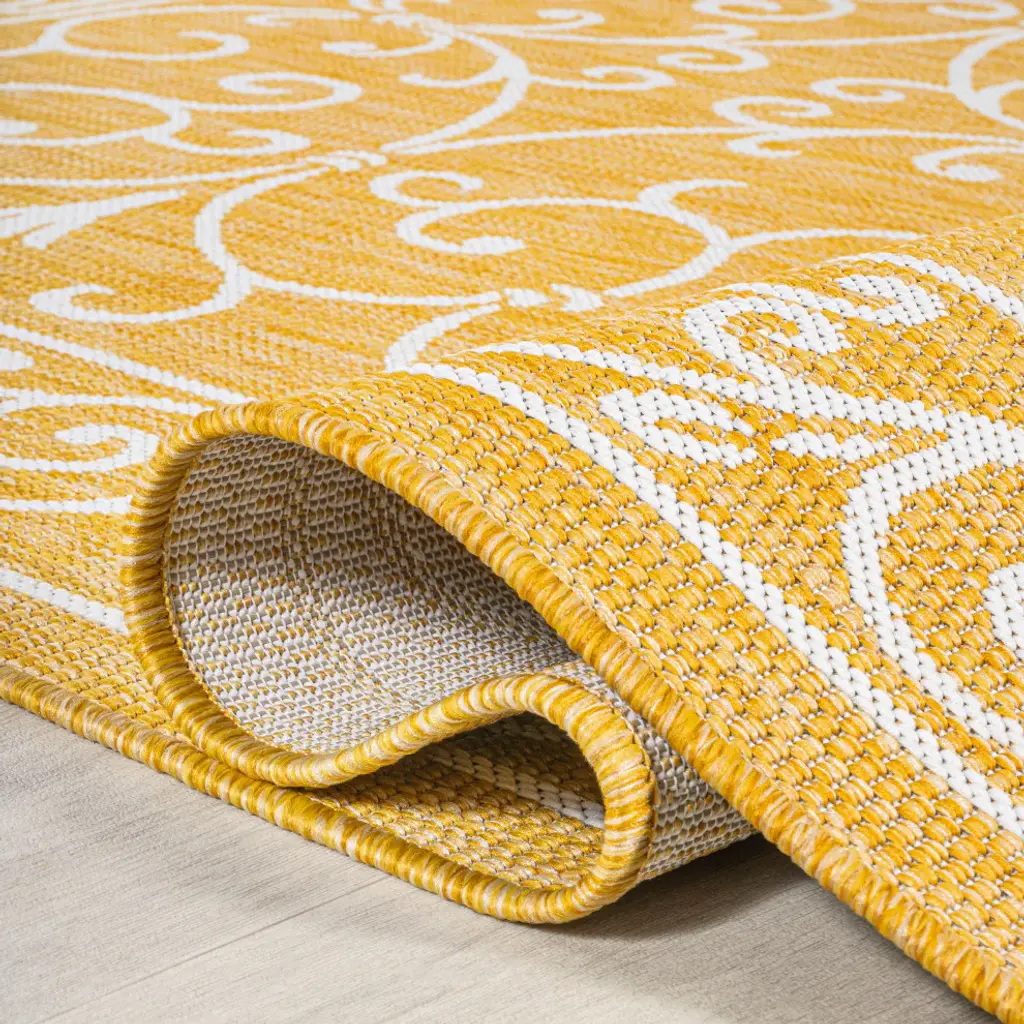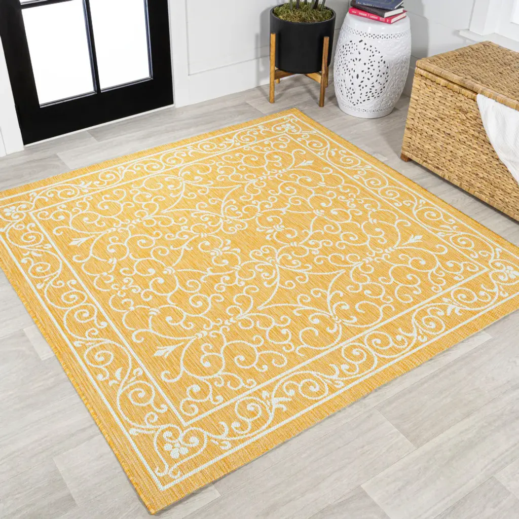 With a filigree design reminiscent of antique iron gates, our Boho-chic rug adds eclectic style to an outdoor porch or patio. Tones of cream mingled with a soft green pattern give this rug a hand-woven, vintage vibe. The flatweave design is great for high-traffic spaces indoors too.Features:• Water resistance with 0.19" pile• Soft green and cream with a handwoven mingled texture• Flat-weave construction of 100% polypropylene• 100% Polypropylene• No backing, use of rug pad is recommended (sold separately)• Power Loomed in Turkey• Actual Dimension: 5 ft. 3 in. x 5 ft. 3 in. Square• Color: Yellow/Cream• Thickness measures: 0.19 in.• Available in multiple sizes and/or colorsRug Care:• Vacuum regularly and spot clean as needed; avoid direct and continuous exposure to sunlight; use brushless vacuum; remove spills immediately; if liquid, blot with clean, undyed cloth by pressing firmly around the spill to absorb as much as possible; for hard to remove stains, professional rug cleaning is recommended; store in a dry, well ventilated area and rotate for consistent wear• Packing and shipping may cause temporary creases in rugs, which will flatten out after a week on the floor; to expedite the process, try back-rolling your rug before laying it down, and then allow ample time for the remaining creases to relax• Please Note: Due to differences in monitors, some rug colors may vary slightly. Lengths and widths may vary from the published dimensions. Patterns may vary slightly according to shape and size selected.About us:Style your floors with JONATHAN Y. By combining fine craftsmanship and design, this New York creative studio is bringing fashion to your floors. The collection mixes sustainable organic materials, vibrant colors and trend worthy styles to create JONATHAN Y''s distinctive catalog of rugs.