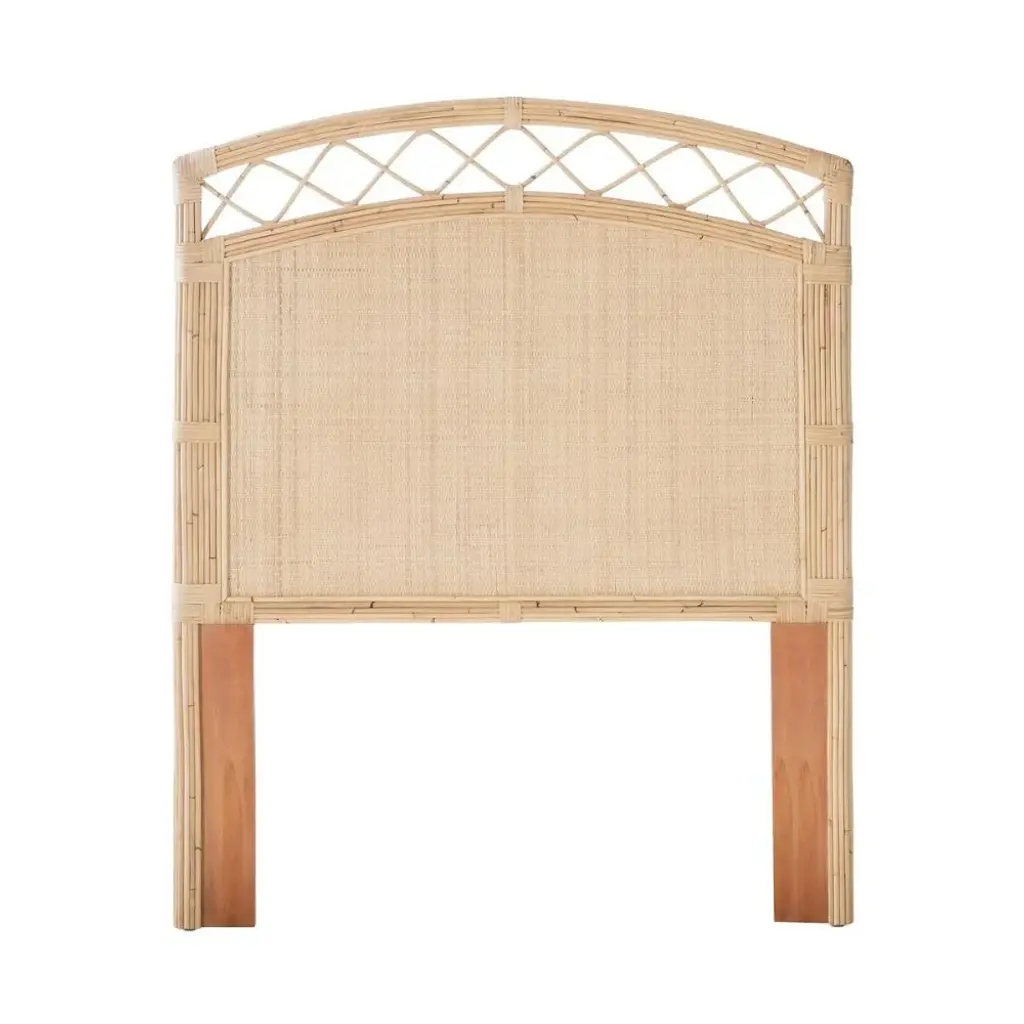 Polished rattan and a close webbed rattan queen headboard are styled with an open arched top. Its' barefoot-friendly style makes a perfect option in a casual or coastal bedroom.